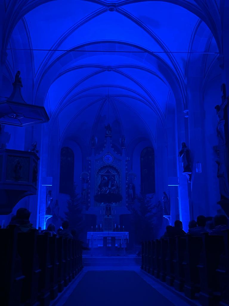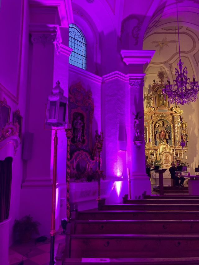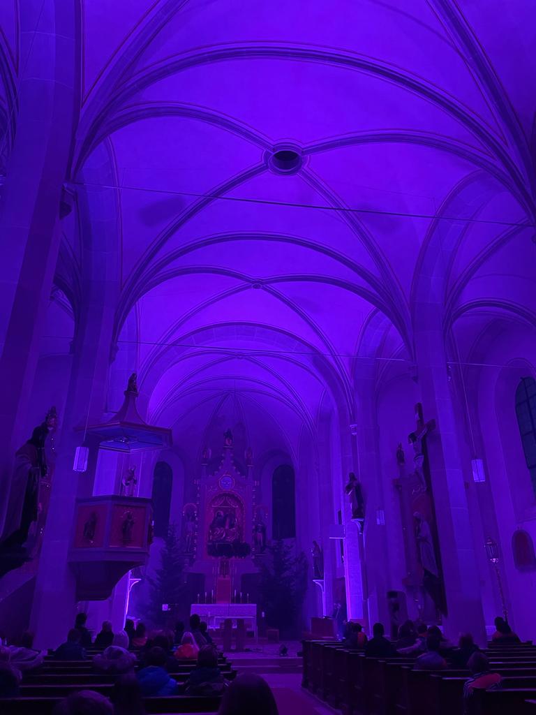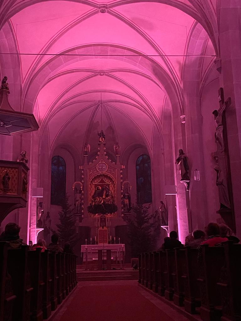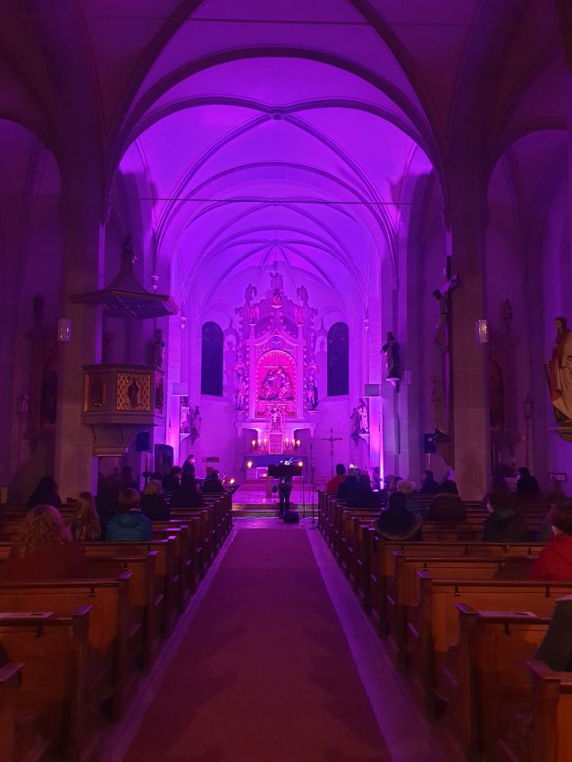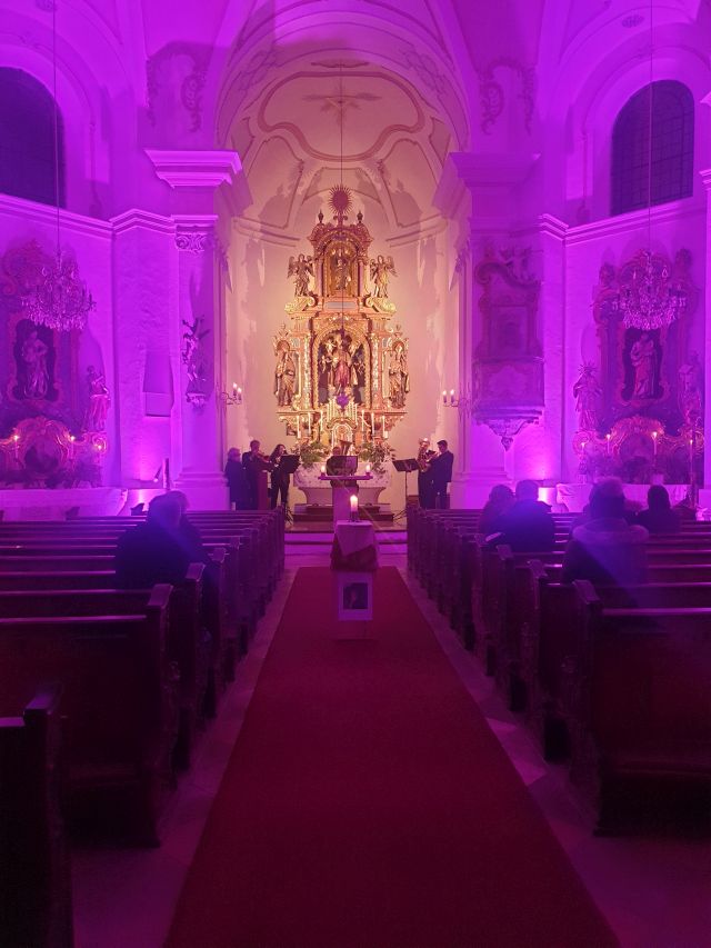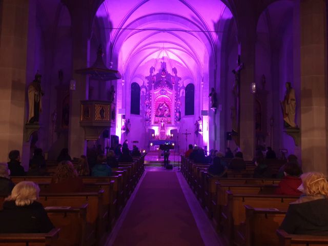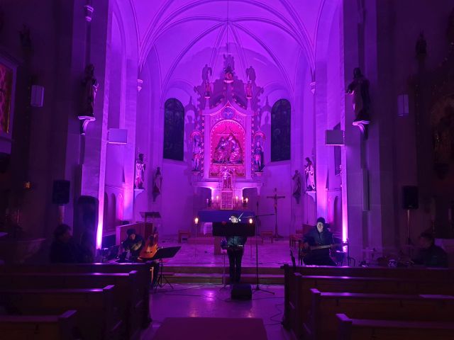 Musik als Resonanz und „DU“ der Schöpfung auf das Leben in all seinen Facetten. So konnte die Cäcilienandacht am Samstagabend empfunden werden, die von einem Ensemble des Rhythmuschors und Quintett-Essenz gestaltet wurde. Außerdem kam zum ersten mal ein Teil der neuen Beleuchtungsanlage zum Einsatz. Ästhetik hat eben viele Facetten. Akustische und Optische.