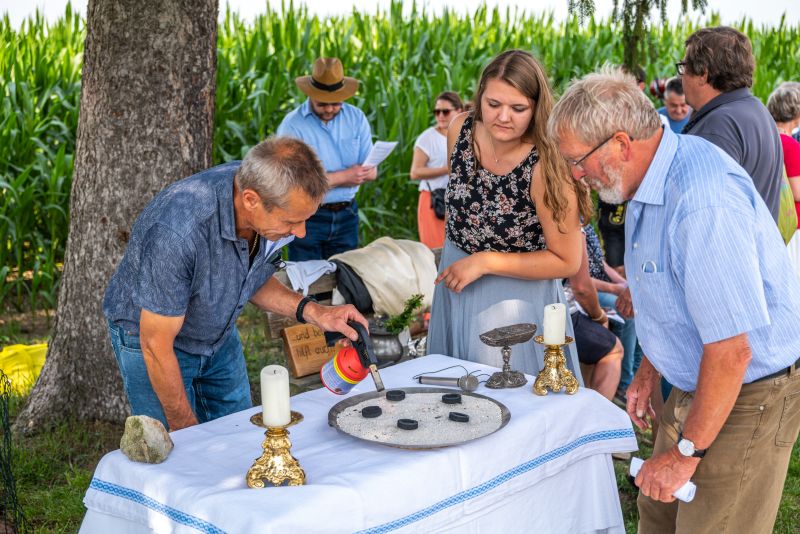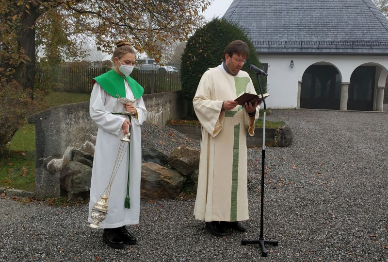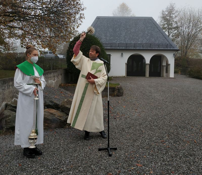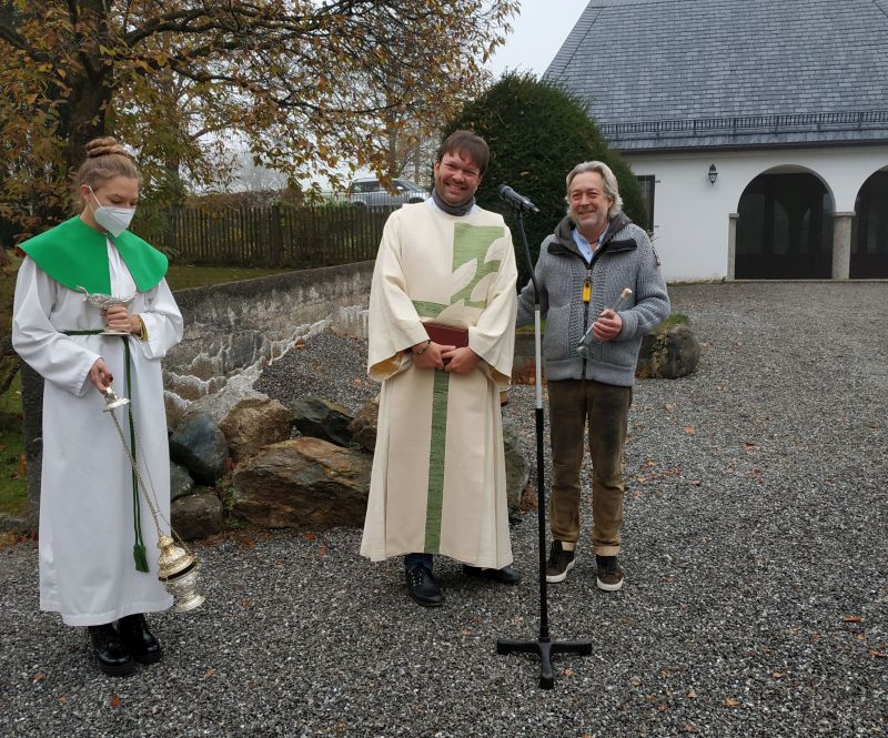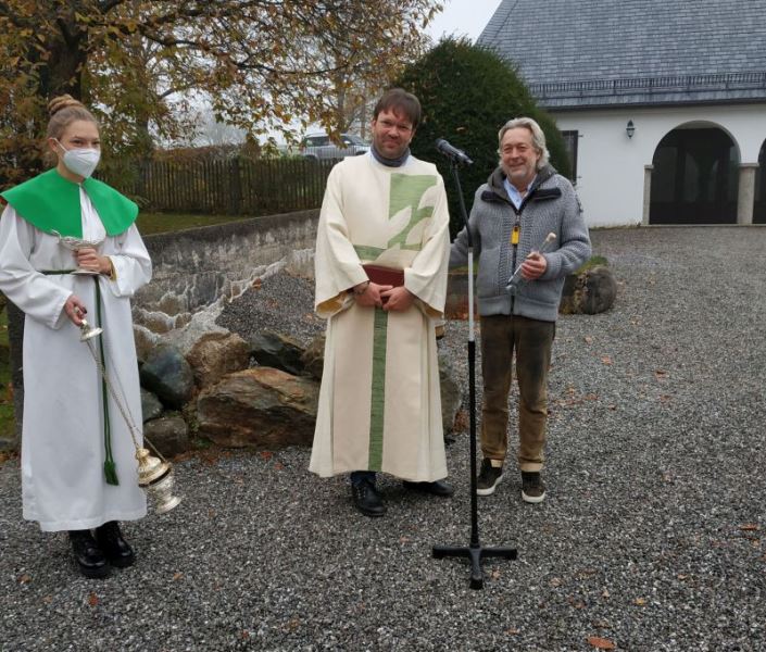 "Die Zukunft positiv mitgestalten geht nur wenn man selber anfängt." Mit diesen Worten umschriebt Gemeindereferent Tobias Gaiser was nach jahrelanger Planung endlich umgesetzt werden konnte. Alle kirchlichen Gebäude in Söllhuben (Kirche, Pfarrheim und Pfarrhof) werden nun nachhaltig mit Fernwärme aus der Hackschnitzelheizung vom Gasthaus Hirzinger beheizt. Ein hoher Verbrauch von fossilen Brennstoffen gehört somit nun der Vergangenheit an. Gesegnet werden konnte die Fernwärmeleitung ja in nur vergrabener Form. Dennoch überreichte Gemeindereferent Tobias Gaiser dem Wirt Lenz Hilger etwas augtenzwinkernd einen symbolisch wärmenden Schnaps, falls die Kirche zuviel Wärme abziehn sollte. Die hier gute Zusammenarbeit zwischen Wirt und Kirche wurde aber dann noch in der guten warmen Stube mit Kirchenverwaltung und der Verwaltungsleiterin Dagmar Hunger unterstrichen. Der kommende Winter kann kommen, denn die Wärmeleitung steht!