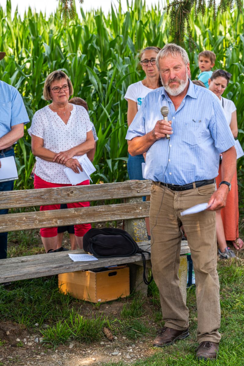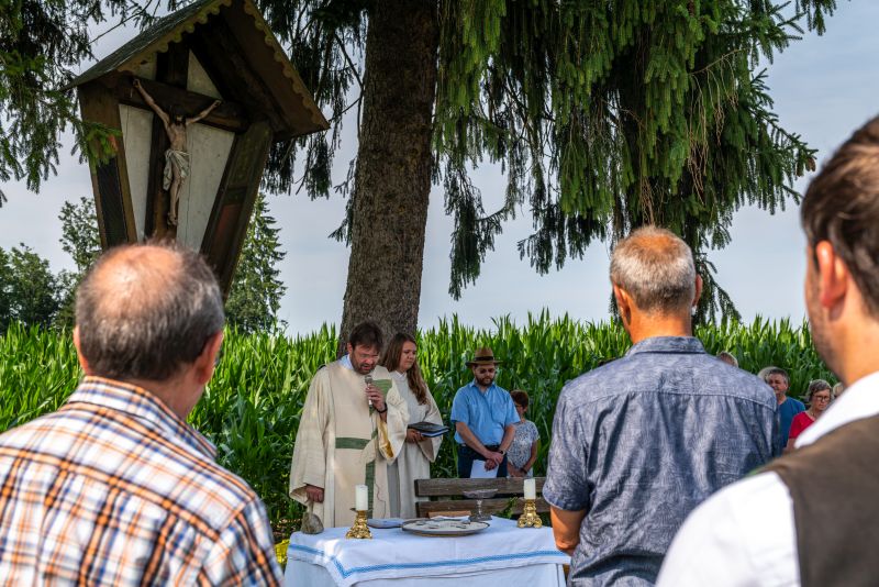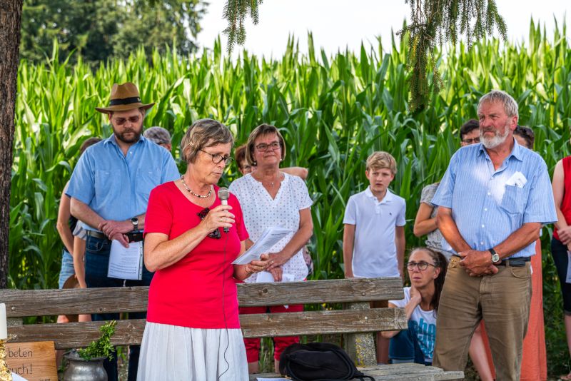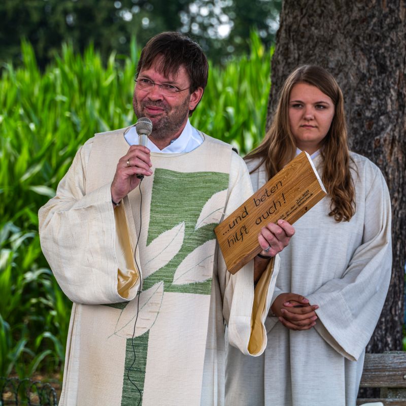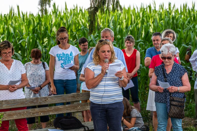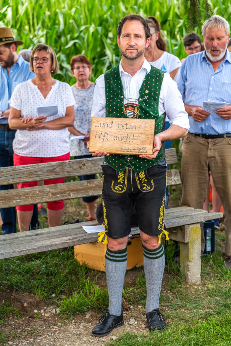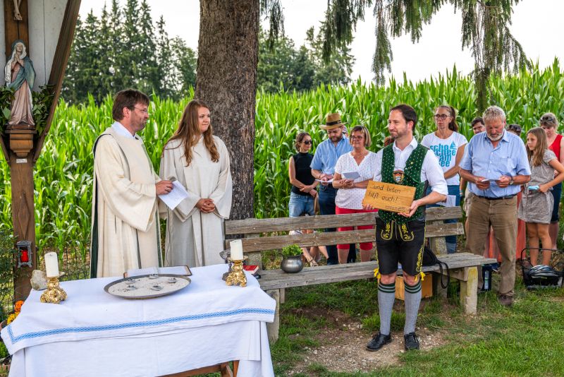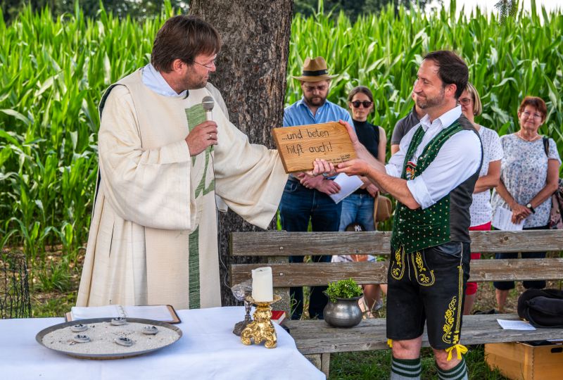 Die Bewahrung der Schöpfung als urchristliches Anliegen sowie persönliche und existenzielle Sorgen von Anwohnern jener Trasse, die für den Brennerzulauf vorgesehen ist, standen im Mittelpunkt einer Andacht am Feldkreuz bei Untermoosen unter dem Motto „…und Beten hilft auch!“ eingeladen hatte. Geleitet wurde die Andacht von Gemeindereferent Tobias Gaiser mit Gemeindeassistentin Jacqueline Egold . Die musikalische Gestaltung übernahmen Riederinger Weisenbläser. Am Ende wurde noch eine Tafel an Bürgermeister Christoph Vodermaier überreicht. "Und beten hilft auch..." - Zammhoitn tut gut, gibt ein Gefühl von Solidarität und hilft auch....