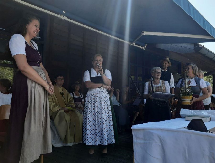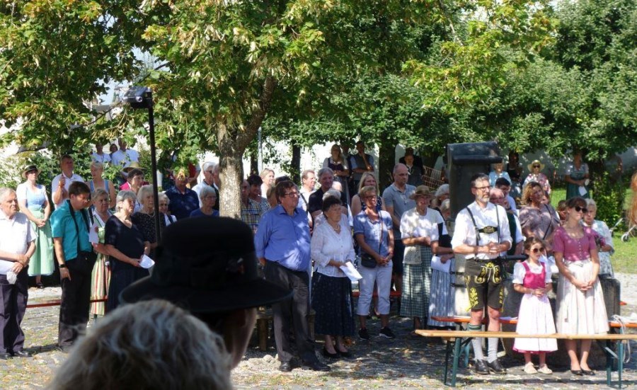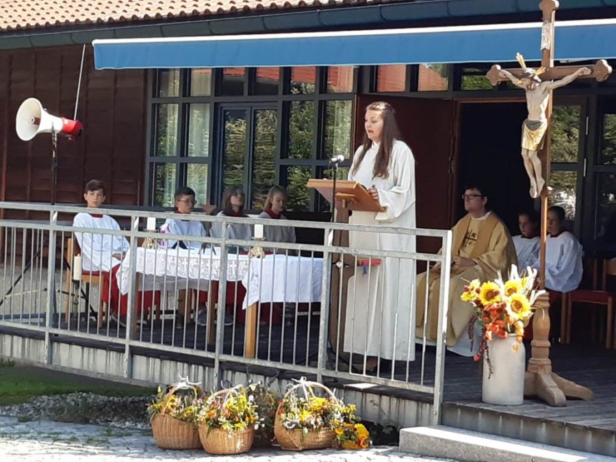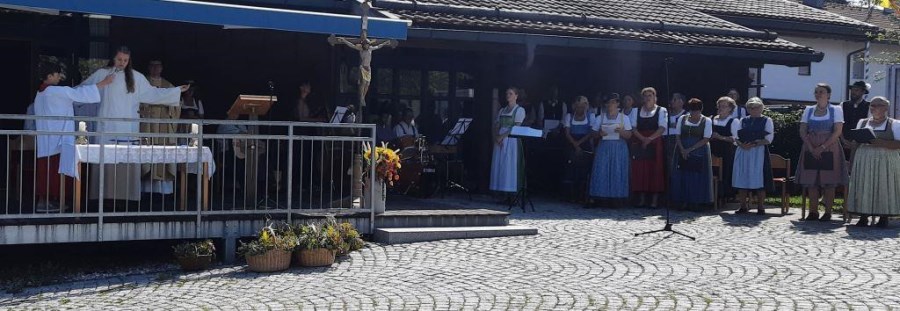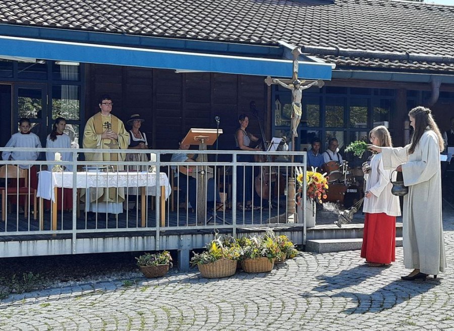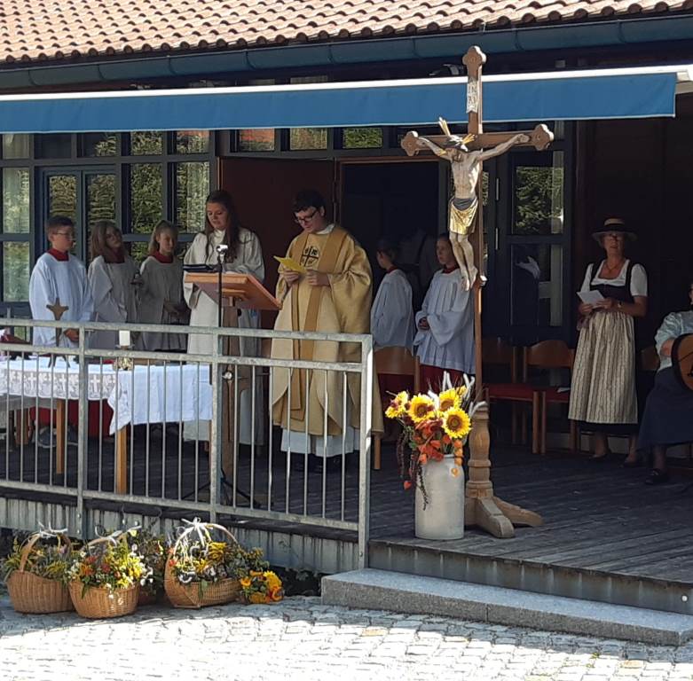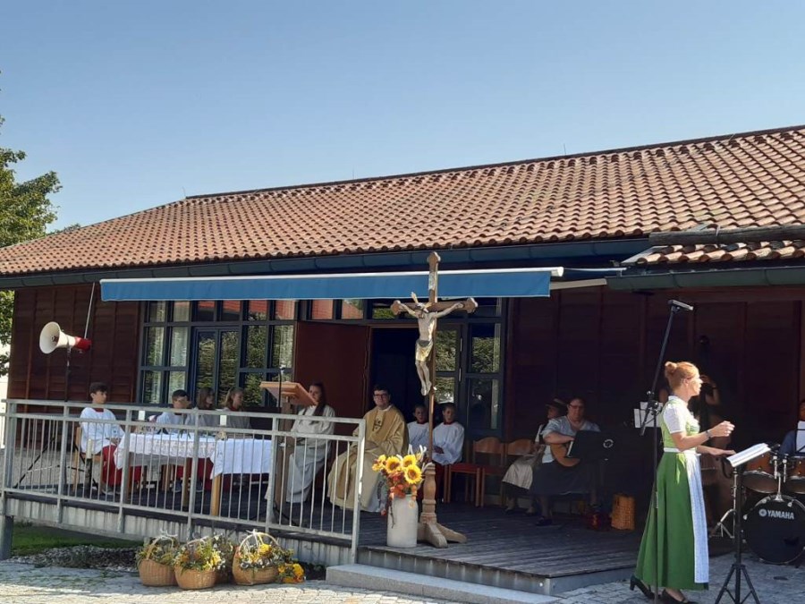 Bei strahlendem Sonnenschein und fast schon zu hohen Temperaturen (aber von Regen hatten wir in diesem Sommer genug) fand auf dem Kirchplatz das feierliche Patrozinium statt. Mit einer Mischung aus Marienliedern, bekannten Kirchenliedern zum Mitsingen und der Misa Criolla mit südamerikanischen Wurzeln gestaltete der Kirchenchor unter instrumenteller Begleitung von E-Piano, Gitarre, Schlagzeug und Kontrabass den musikalischen Rahmen für den Gottesdienst.