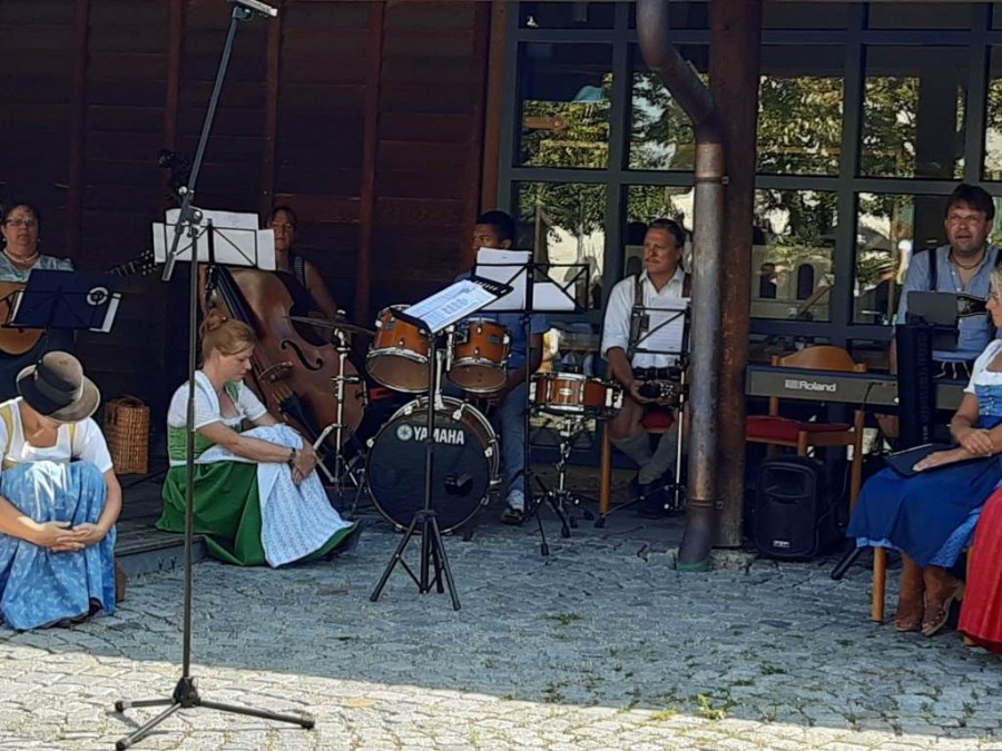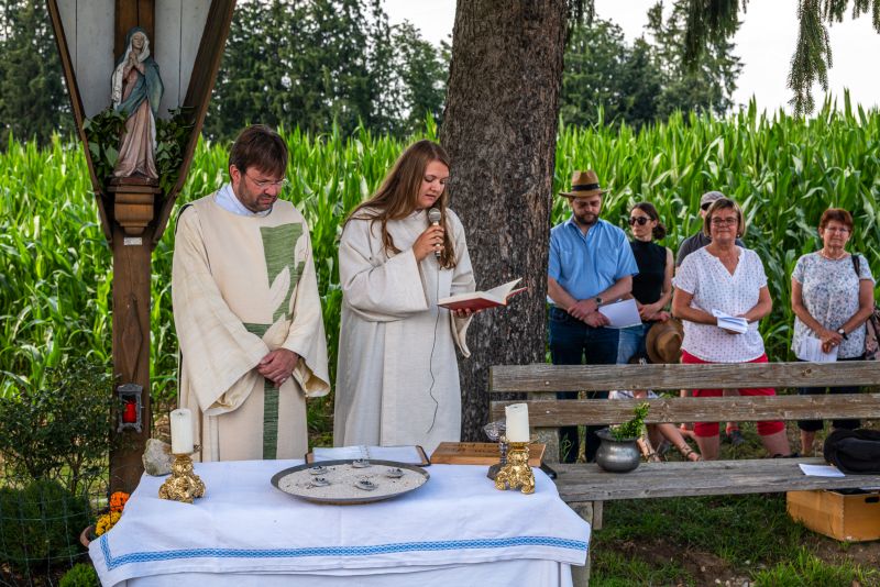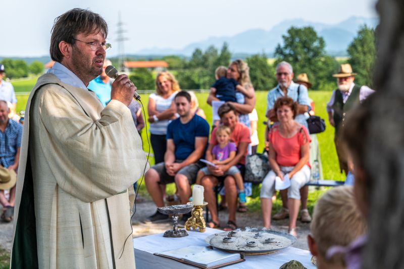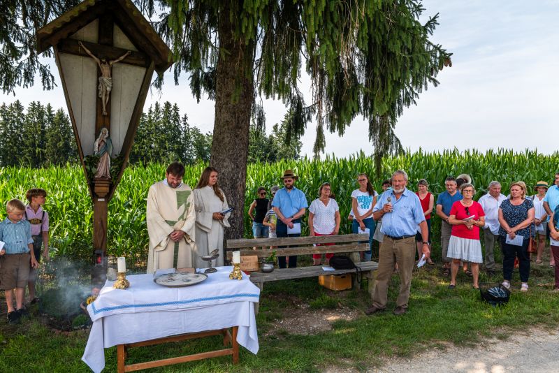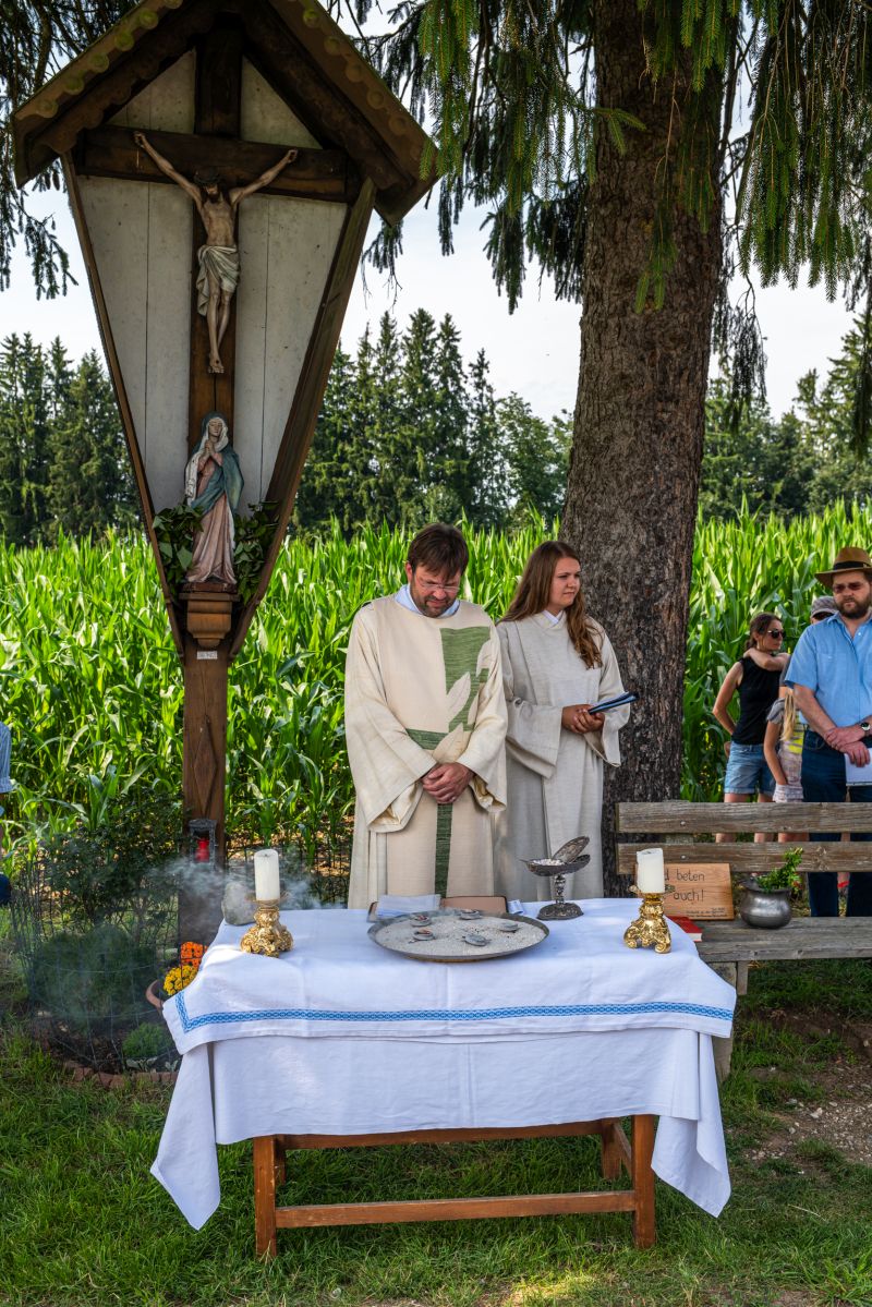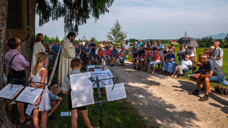 Bei strahlendem Sonnenschein und fast schon zu hohen Temperaturen (aber von Regen hatten wir in diesem Sommer genug) fand auf dem Kirchplatz das feierliche Patrozinium statt. Mit einer Mischung aus Marienliedern, bekannten Kirchenliedern zum Mitsingen und der Misa Criolla mit südamerikanischen Wurzeln gestaltete der Kirchenchor unter instrumenteller Begleitung von E-Piano, Gitarre, Schlagzeug und Kontrabass den musikalischen Rahmen für den Gottesdienst.
