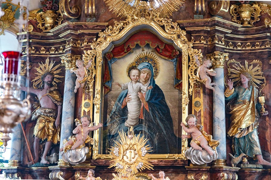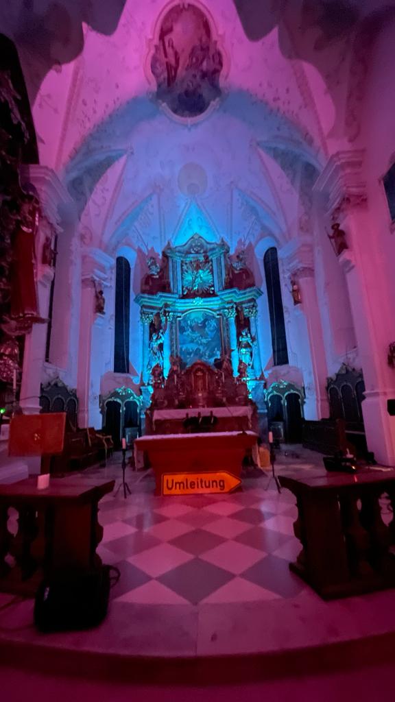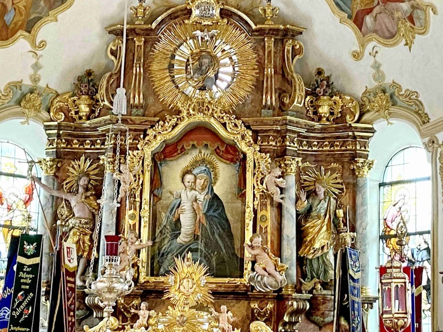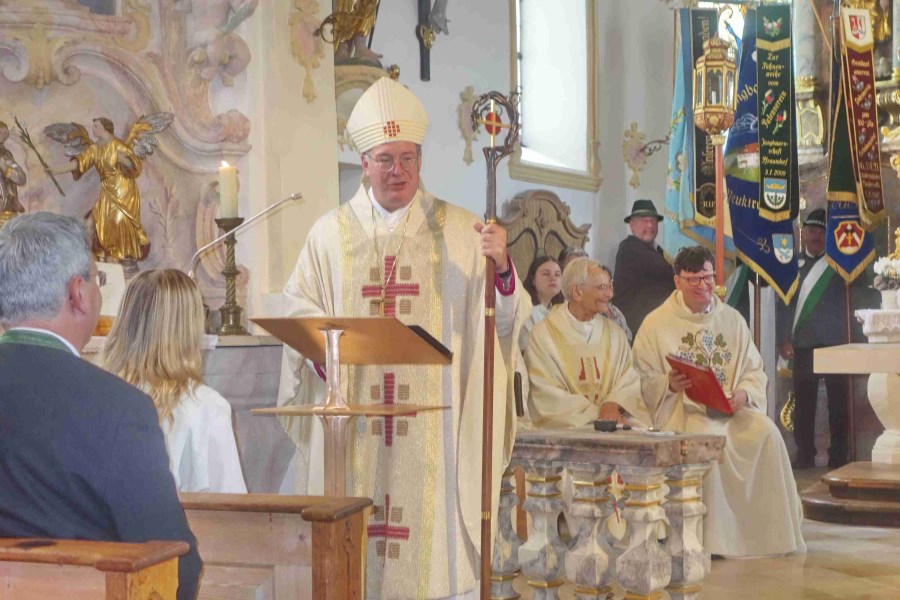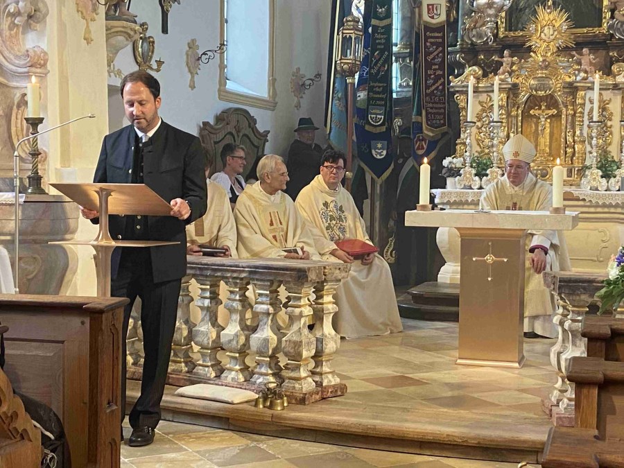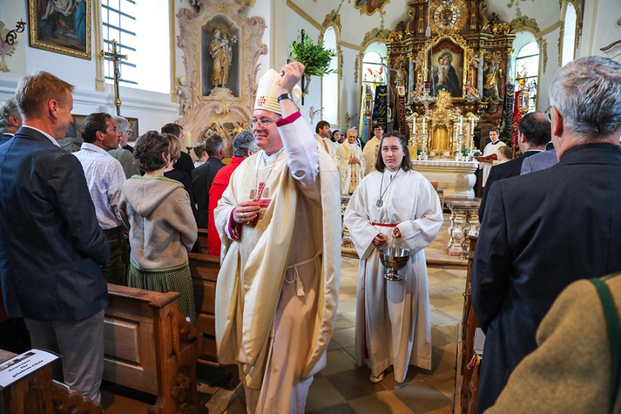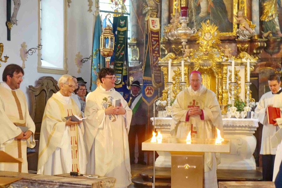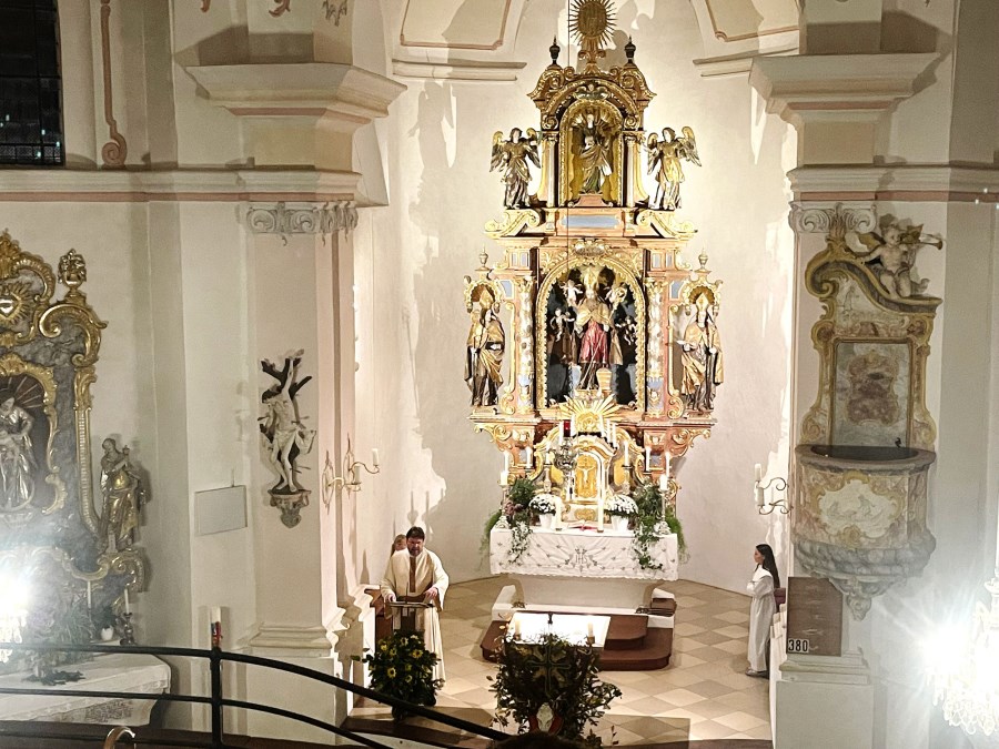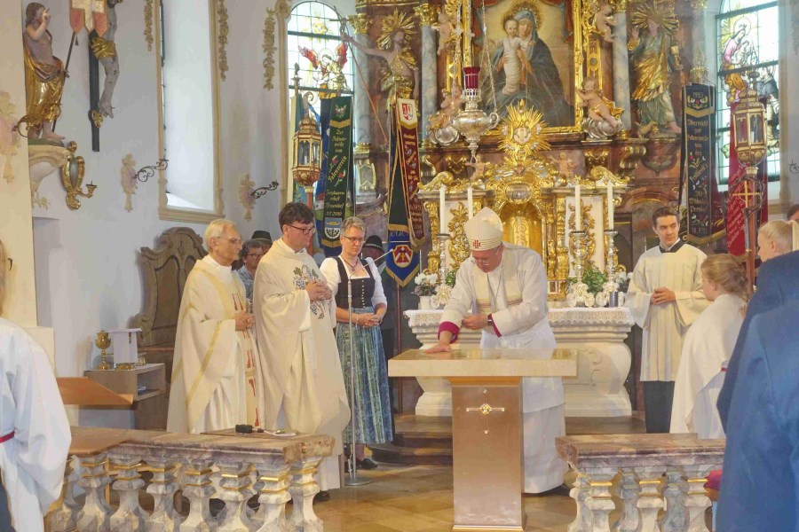 Neukirchen/Riedering – „Feiern und leben Sie das hier und tragen Sie das in die Welt hinaus.“ Weihbischof Rupert Graf zu Stolberg bat beim Festgottesdienst um Gottes Segen für die Gläubigen und für die Wallfahrtskirche Maria Stern in Neukirchen. Hoch über dem Simssee thront die Wallfahrtskirche Sankt Johannes der Täufer mit dem über 300 Jahre alten Gnadenbild – das namensgebende Maria Stern. Und dort wurden „in archaischen Riten“, so Weihbischof Graf von Stolberg), der neue Volksaltar sowie Altarleuchter, Ambo und Leuchter, die letzten vom Rosenheimer Künstler Josef Hamberger (1925-2019) entworfenen Kunstwerke, gesegnet.