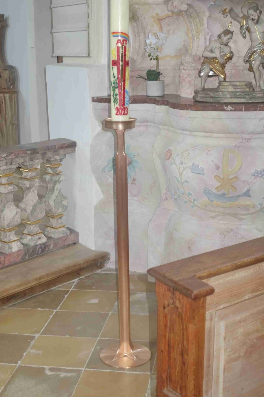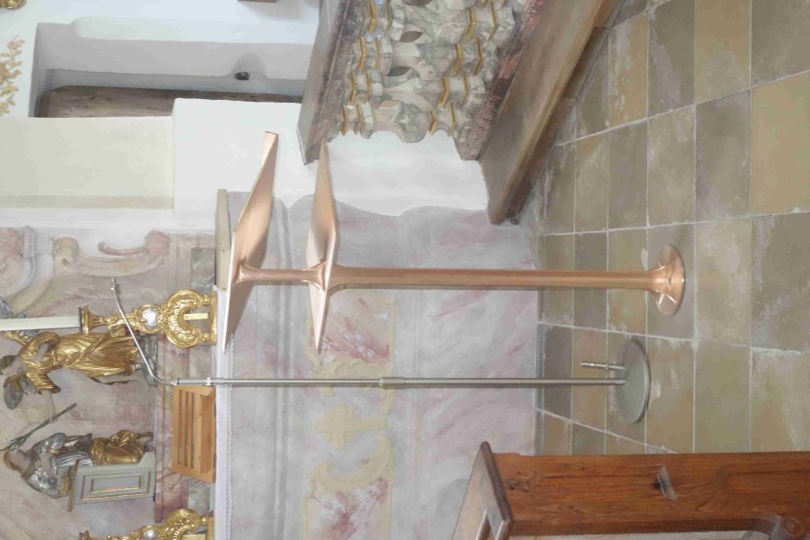 Ein schlank nach oben strebendes Ensemble aus Bronze, das sich unaufdringlich in den beengten, barock ausgestalteten Altarraum einfügt.