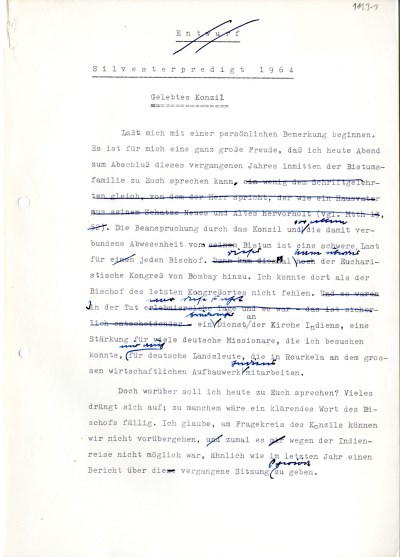 Typoskripte mit handschriftlichen Korrekturen bzw. Unterstreichungen von Kardinal Döpfner, 1964