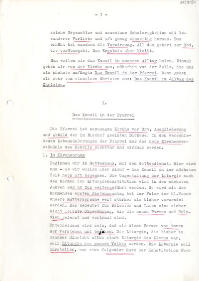 Darin erklärte Döpfner die Pfarrei zum „Prüfstein“ des neuen konziliaren Kirchenverständnisses. Kirche als Volk Gottes müsse in allen Lebensäußerungen der Pfarrei, vom Gottesdienst über die Zusammenarbeit zwischen Priestern und Laien bis in den christlichen Alltag eines jeden Gläubigen hinein sichtbar und wirksam werden. Es sei notwendig, dass die vom Konzil 1963 beschlossenen liturgischen Reformen innerlich verstanden und bejaht werden. Nur so könne die Liturgie, „die bisher in mancher Hinsicht allzu stark die Liturgie des Klerus war […] die Liturgie des ganzen Volkes werden“. An der Notwendigkeit der Liturgiereform ließ er keinen Zweifel. Das vertiefte Verständnis der Kirche als Volk Gottes fordere einen entsprechenden Gottesdienst. Die Verwendung der Muttersprache sei unverzichtbar, weil „der heutige Mensch, auch der Christ es ablehnt, etwas zu tun, was ihm nicht einleuchtend und sinnvoll erscheint“.