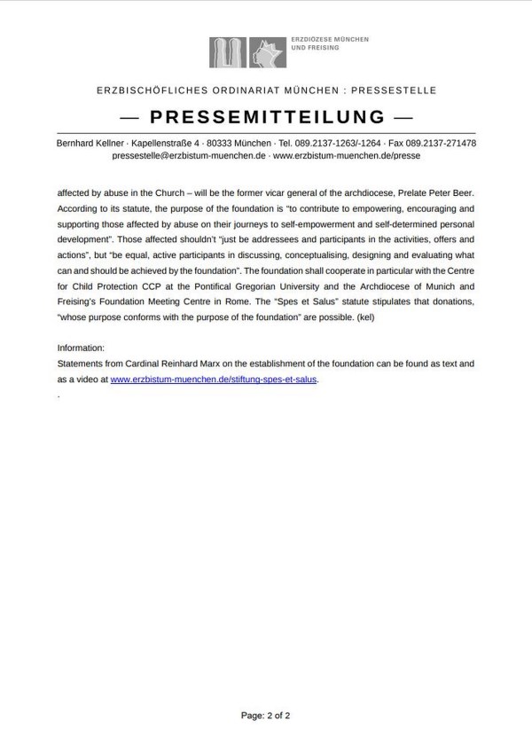 Als Zeichen persönlicher Verantwortungsübernahme und des Willens zur Wiedergutmachung errichtete Kardinal Marx im Dezember 2020 aus Mitteln seines Privatvermögens die Stiftung „Spes et Salus" , die unter dem Dach der St. Korbinian-Stiftung des Erzbistums verwaltet wird. Sie hat laut Satzung zum Ziel, „dazu beizutragen, dass die von Missbrauch Betroffenen auf dem Weg ihrer Selbstermächtigung und selbstbestimmten persönlichen Entwicklung gestärkt, gefördert und unterstützt“ werden. Die Stiftung soll insbesondere mit dem von der Erzdiözese unterstützten Zentrum für Kinderschutz (CCP ) an der Päpstlichen Universität Gregoriana und dem Begegnungszentrum der Erzdiözese in Rom kooperieren.