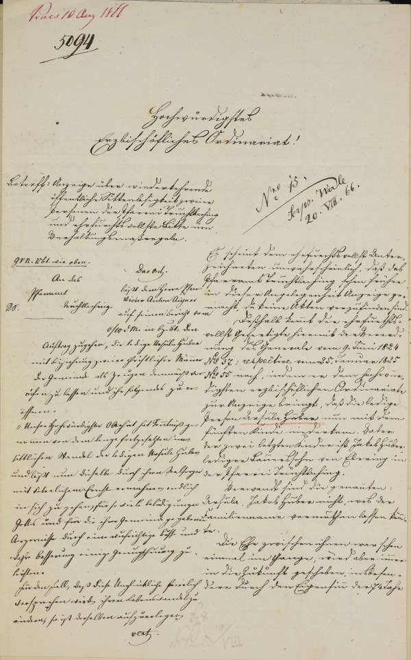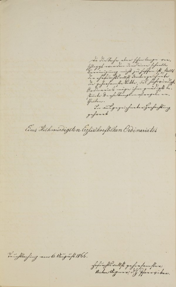 Schreiben des Pfarrvikars Anton Aigner von Truchtlaching an das Erzbischöfliche Ordinariat München, 6. August 1866, mit Konzept des Antwortschreibens