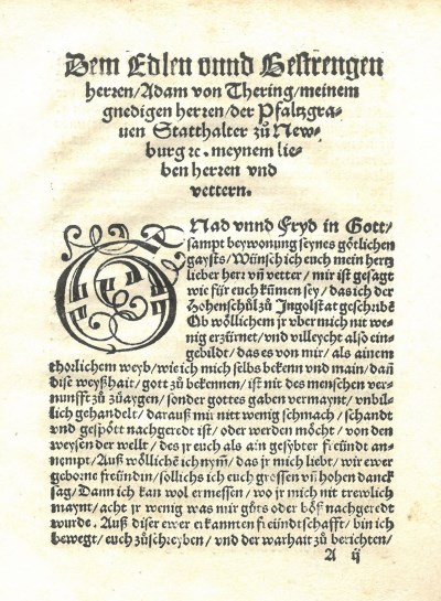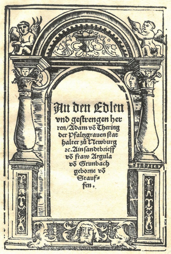 An den Edlen vnd gestrengen herren / Adam von Thering der Pfaltzgraven stathalter zu Newburg etc. Ain sandtbrieff von fraw Argula von Grumbach geborne von Stauffen, [Augsburg (Philipp Ulhart d.Ä.)] 1523