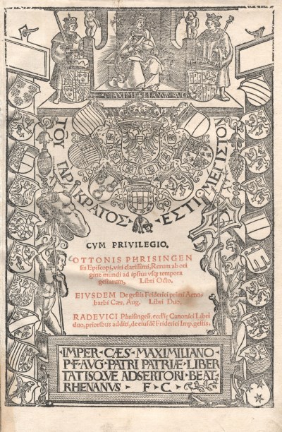Der Titelholzschnitt ist eine Huldigung an den Kaiser: Maximilian I. thront zwischen seinen Enkeln Karl (später Kaiser Karl V.; rechts) und Ferdinand (später Kaiser Ferdinand I.). 27 Wappen habsburgischer Königreiche und Erbländer umgeben den kaiserlichen Doppeladler. In die schwarze Rahmung ist in Rot der Titel des Werkes eingedruckt. Bischof Otto wird hier als „vir clarissimus“ (hochberühmter Mann) bezeichnet.