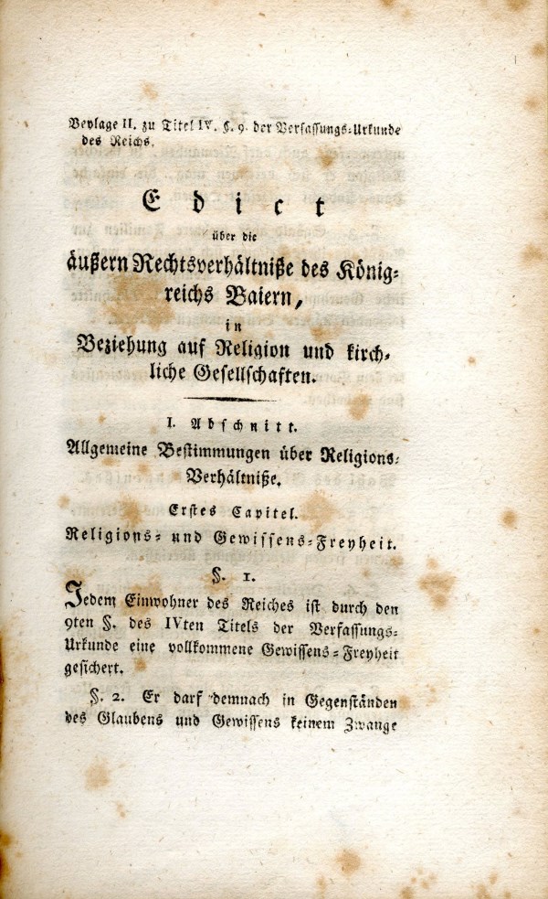Die zweite Verfassung des Königreichs wurde am 27. Mai 1818 von König Max I. Joseph beschworen. Eine Beilage dazu bildete das „Edict über die äußern Rechts-Verhältnisse der Einwohner des Königreichs Baiern“. Diesem wiederum schlossen sich als Anhänge das Konkordat von 1817 und das „Edict über die innern Kirchlichen Angelegenheiten der Protestantischen Gesammt-Gemeinde“ an. Dadurch war der Rang des Konkordats gegenüber der Verfassung deutlich gemindert.