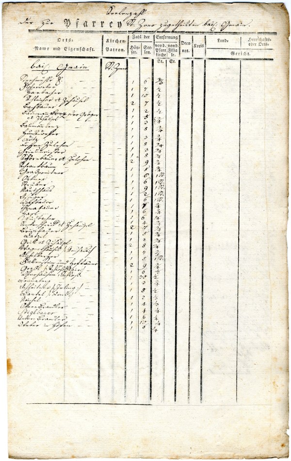 Auf der handgezeichneten Karte verläuft die „alte Salzburgische Graenze“ etwa mittig von unten nach oben. Der bayerische Teil der Pfarrei Gmain liegt links davon. Die Ortsliste führt die Namen der Siedlungen sowie die Zahl der Häuser (45) und der Seelen (258), die der bayerischen Pfarrei damit zuwuchsen, auf, dazu auch die Gehdauer zur nunmehr zuständigen Pfarrkirche St. Zeno.