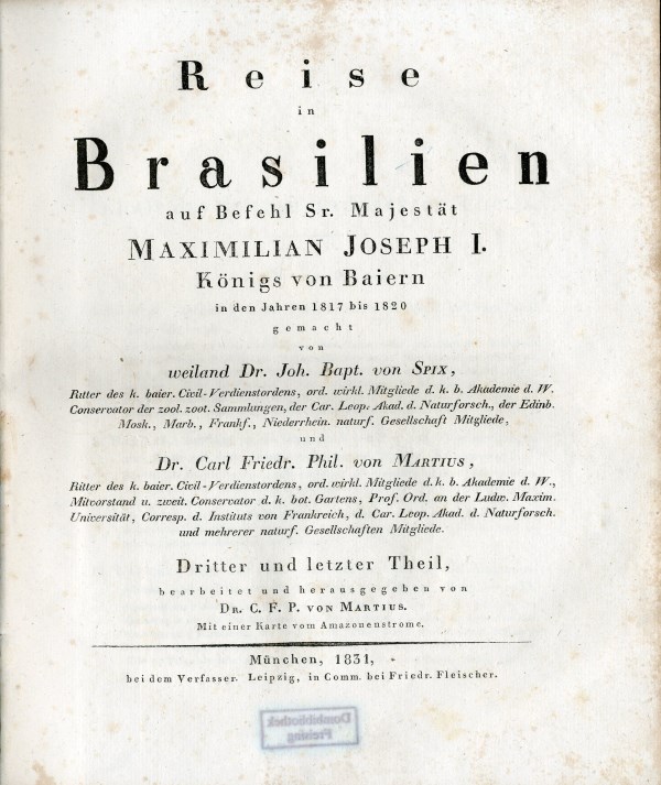 Reise in Brasilien[,] auf Befehl Sr. Majestät Maximilian Joseph I. Königs von Baiern in den Jahren 1817 bis 1820 gemacht von weiland Dr. Joh. Bapt. von Spix […] und Dr. Carl Friedr. Phil. von Martius […]. Dritter und letzter Theil, bearbeitet und herausgegeben von Dr. C. F. P. von Martius […], München 1831