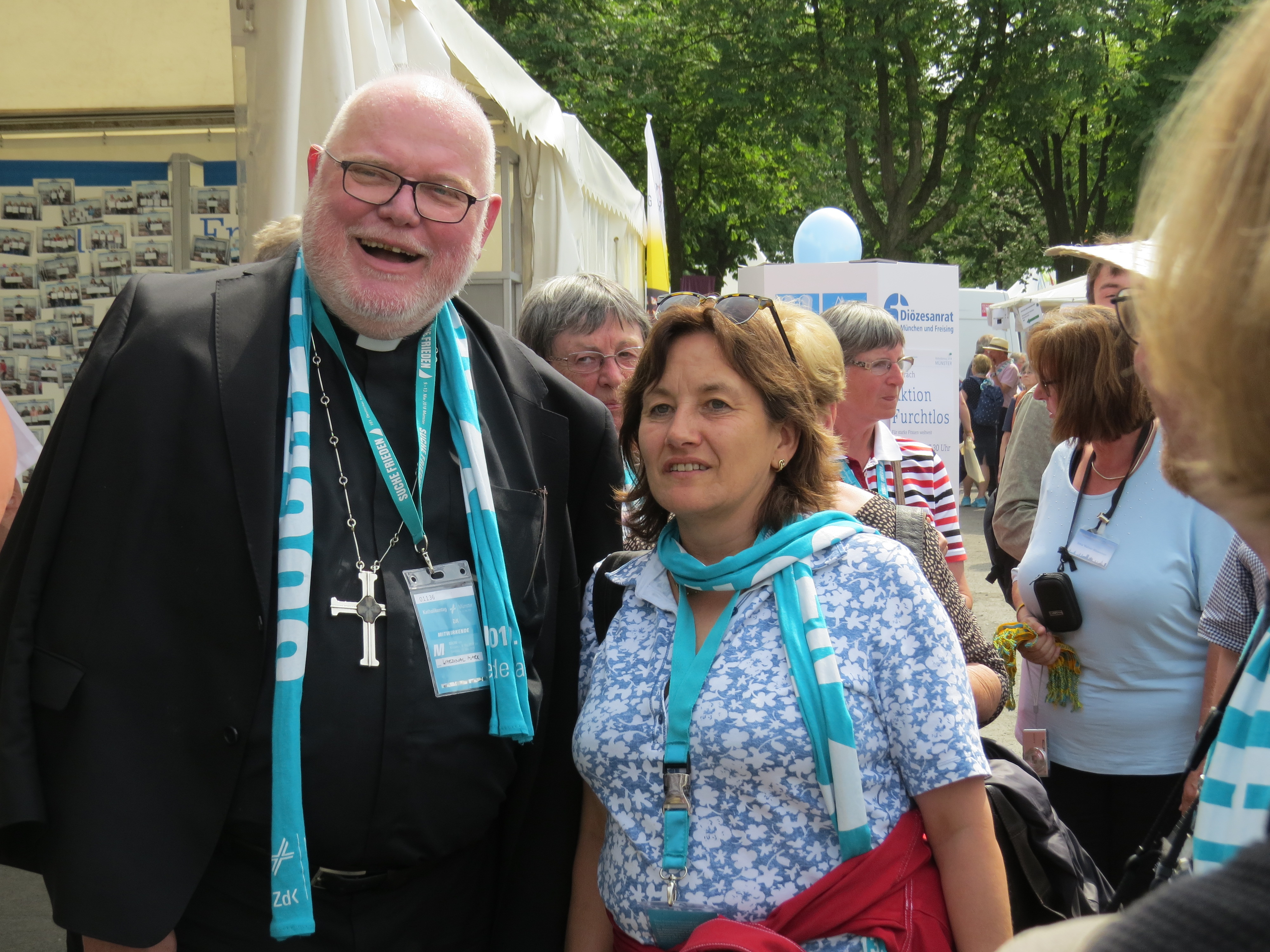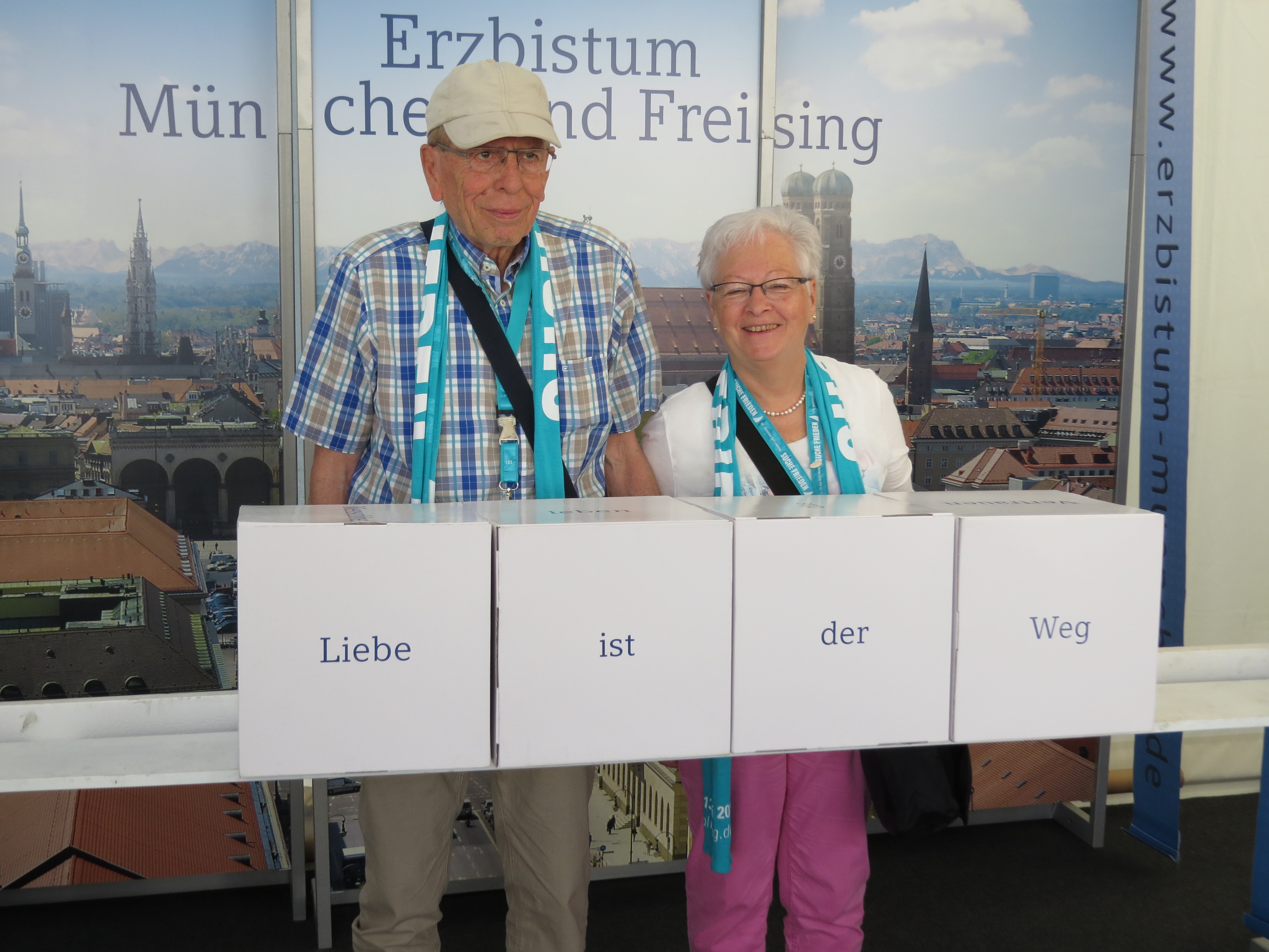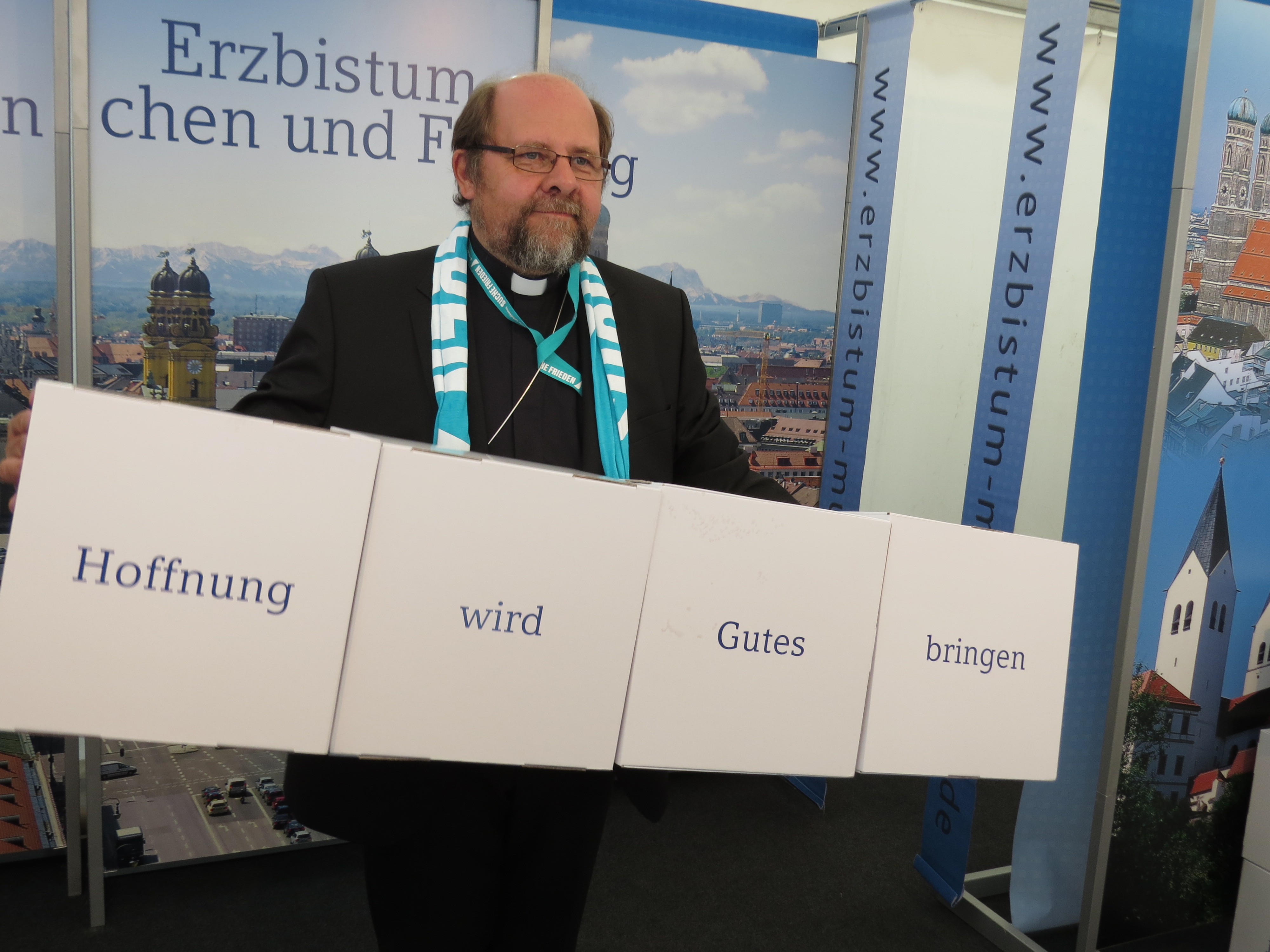 Beim eben zu Ende gegangenen Katholikentag präsentierte sich das Erzbistum wieder mit einem gemeinsamen Stand von EOM und Diözesanrat. Das Leitwort „Suche Frieden“ prägte die ganzen drei Tage die Aktivitäten am Stand. Die Besucherinnen und Besucher waren eingeladen eigene Friedensbotschaften zu formulieren. Dazu standen 40 Würfel mit verschiedenen Wörtern zur Verfügung. Diese Friedensaktion wurde so gut angenommen, dass am Ende über 400 Bilder entstanden. Intensiv machten sich die Gäste Gedanken über ihre Friedensworte. Ergänzt wurden die Materialien durch die bewährten Freundschaftsbänder, die auch diesmal aus Ecuador kamen. Ein großer Erfolg für alle, die an der Planung und Durchführung beteiligt waren. Der Dank gilt allen ehren- und hauptamtlichen Mitarbeiterinnen und Mitarbeitern, die in den Tagen von Münster dabei waren.