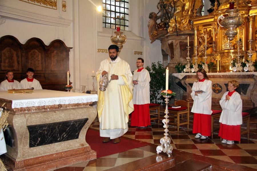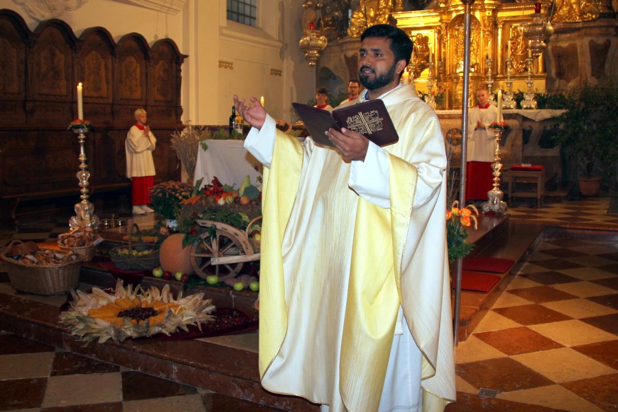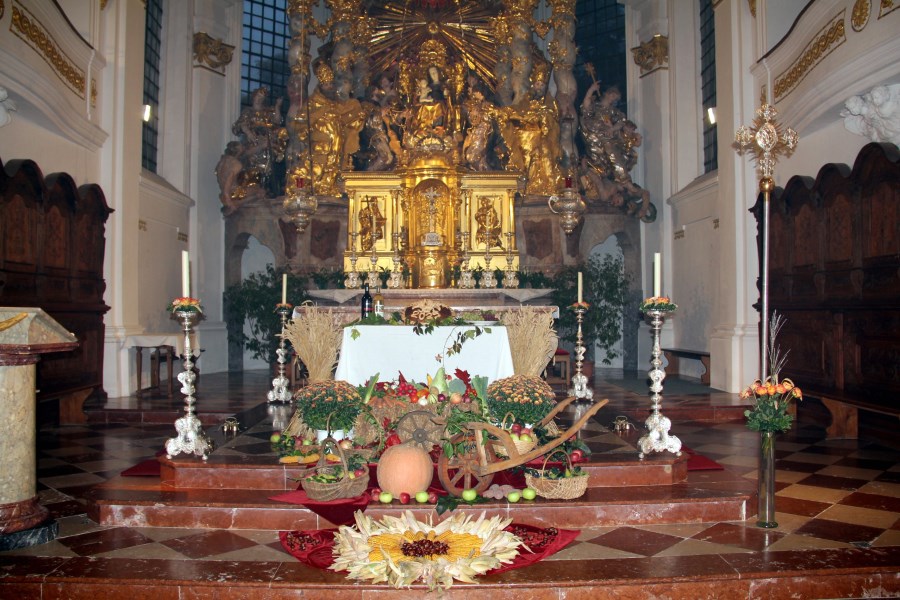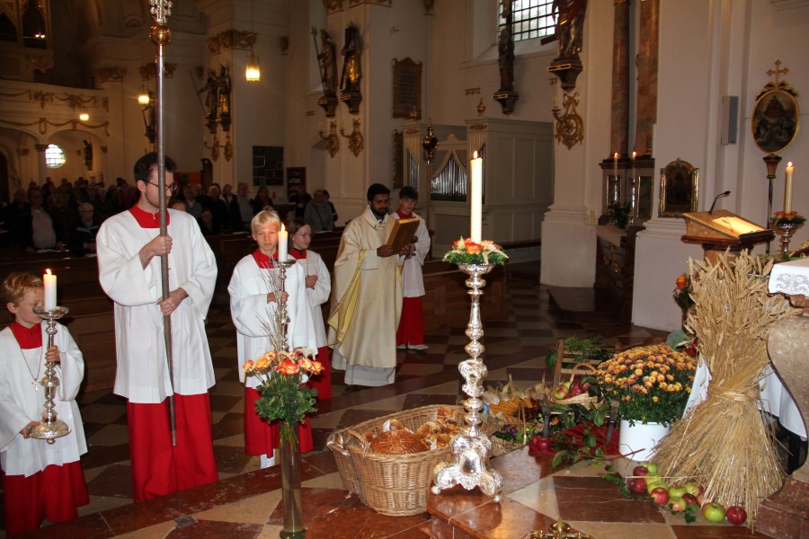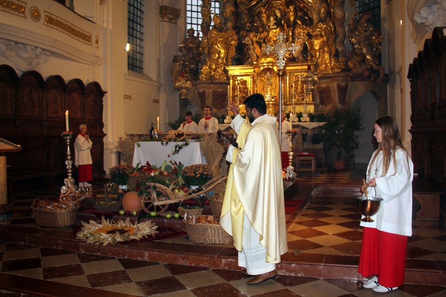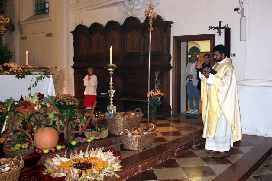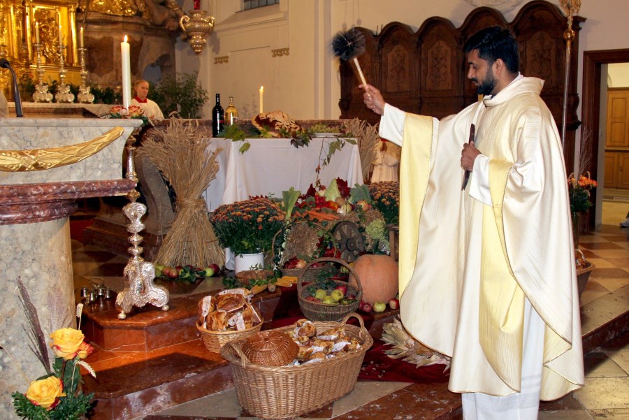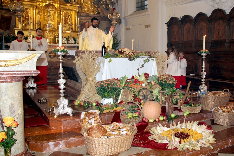 Für diesen Anlass hat Mesner Biagio D’Addio zusammen mit Brigitte Bannert und Melanie Lanzinger die Pfarrkirche Maria Dorfen festlich geschmückt. Bei den gut besuchten Festgottesdiensten am Samstag- und Sonntagabend mahnten die Zelebranten Pater Bibin und Pater Paul, sich immer dankbar zu zeigen, für eine gute Ernte, für ausreichend Lebensmittel und alles, was wir für ein gutes Leben brauchen. Die Ministranten verkauften am Ende der