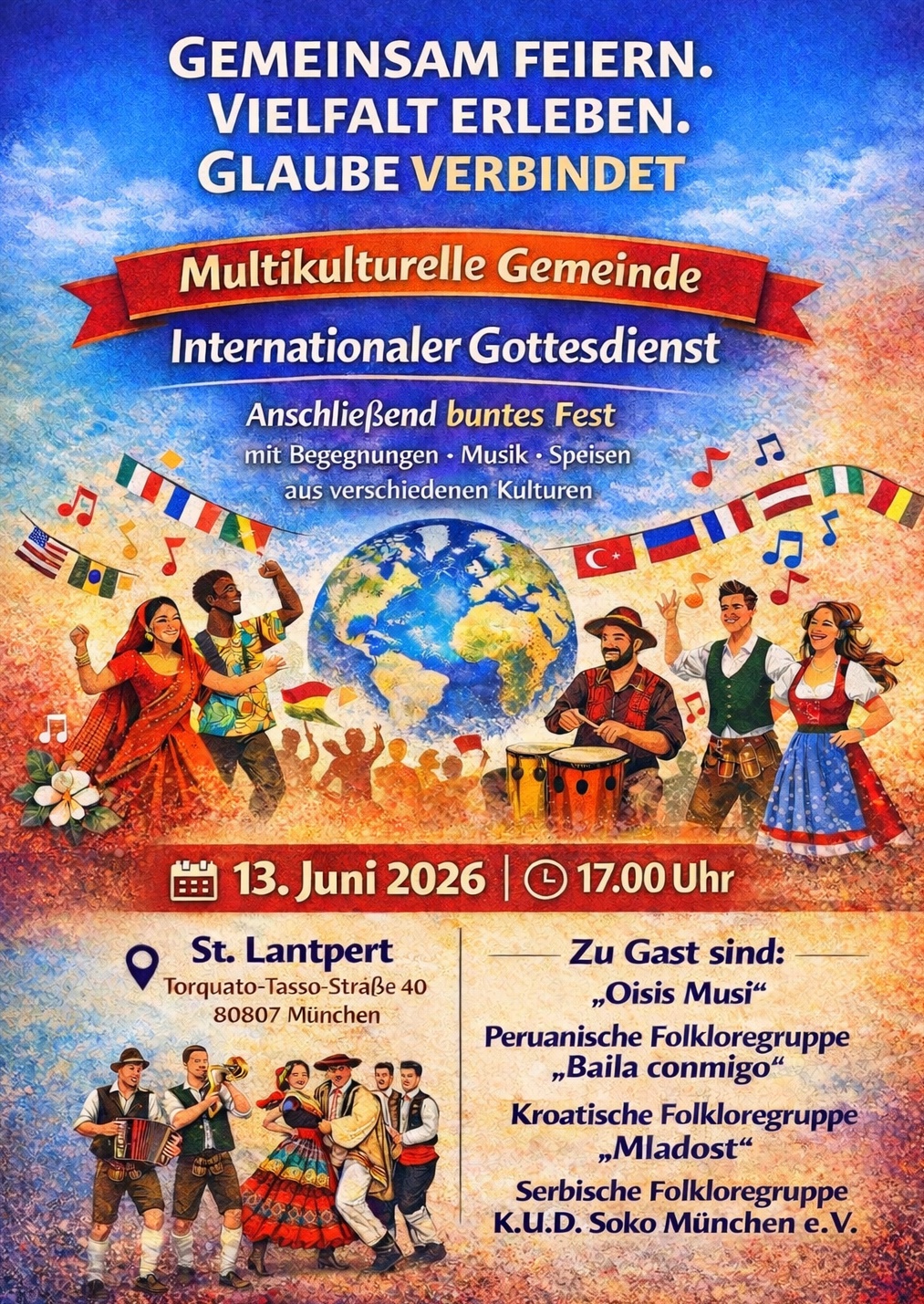 , anschließend buntes Fest mit Begegnungen, Musik, Speisen aus verschiedenen Kulturen im Pfarrheim