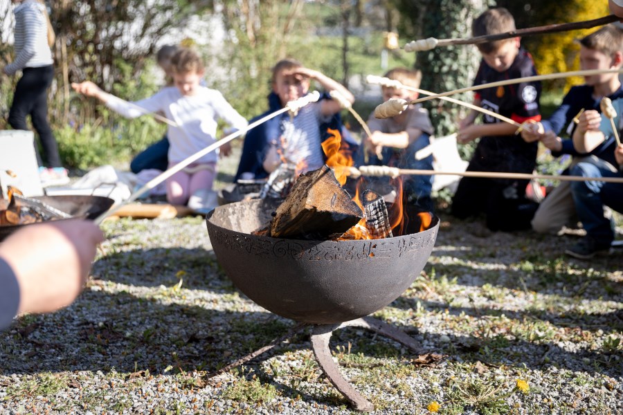 Abschlussrunde mit allen Kindern und Müttern um Feuerschalen
