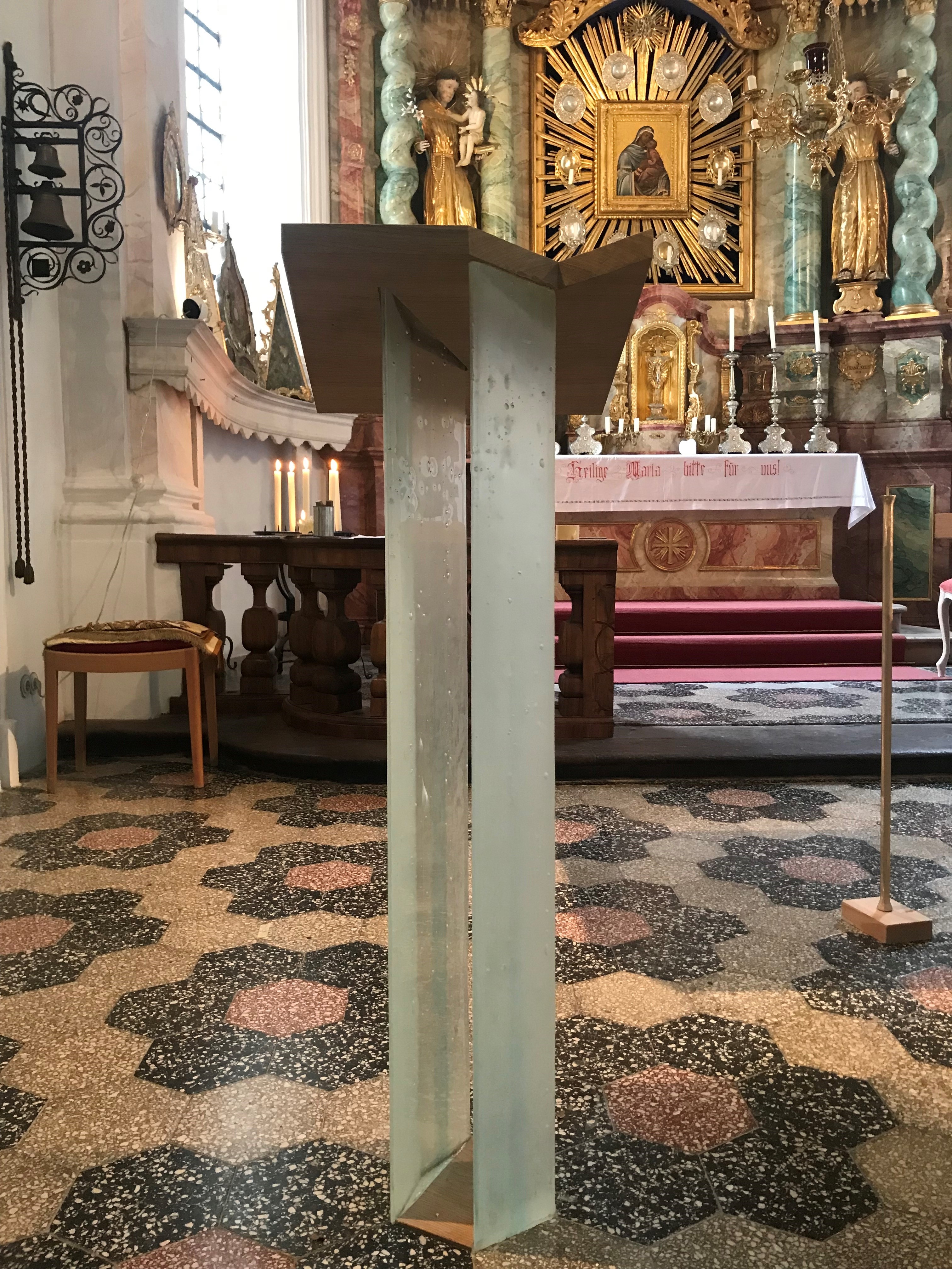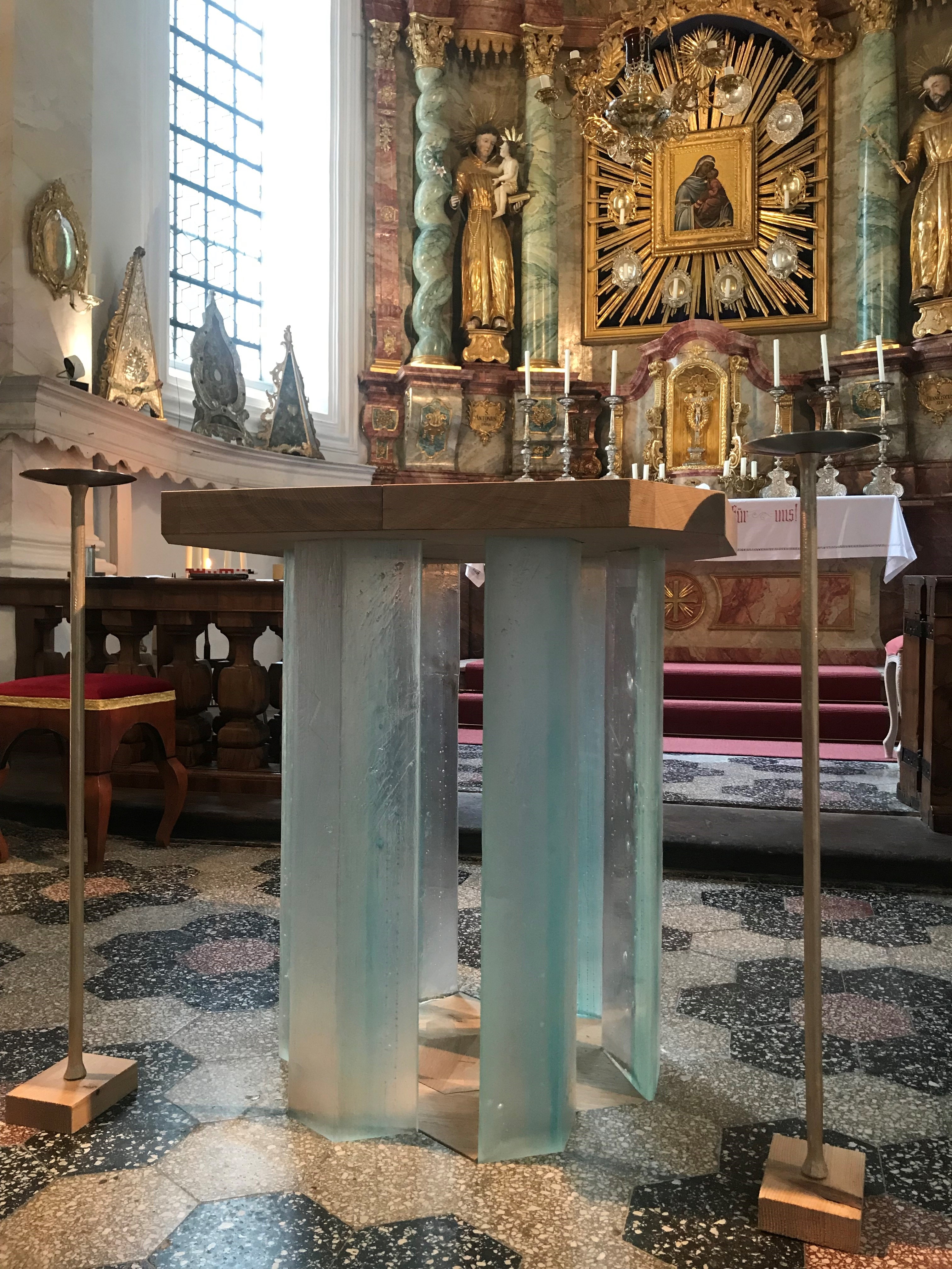 Den neuen Altar konzipierte der für die Gestaltung der Christophoruskapelle im Flughafen München bekannt gewordene Künstler Florian Lechner. Der Altar steht auf sechs dreieckigen Glasstelen. Diese sind an einer schmalen, hölzernen Bodenplatte befestigt und führen zu der sechseckigen Altarmensa, die aus Eichenholz gefertigt ist. Der Ambo ist links nahe der Chorstufe situiert: Hier tragen zwei adäquat gestaltete gläserne Pfeiler die hölzerne Buchauflage. Die Kosten für die liturgische Neuausstattung belaufen sich auf rund 45.000 Euro. Finanziert wurden sie von der Pfarrei, dem Verein Ausstellungshaus für christliche Kunst in München und der Hauptabteilung Kunst im Erzbischöflichen Ordinariat, die 10.000 Euro beisteuerte.