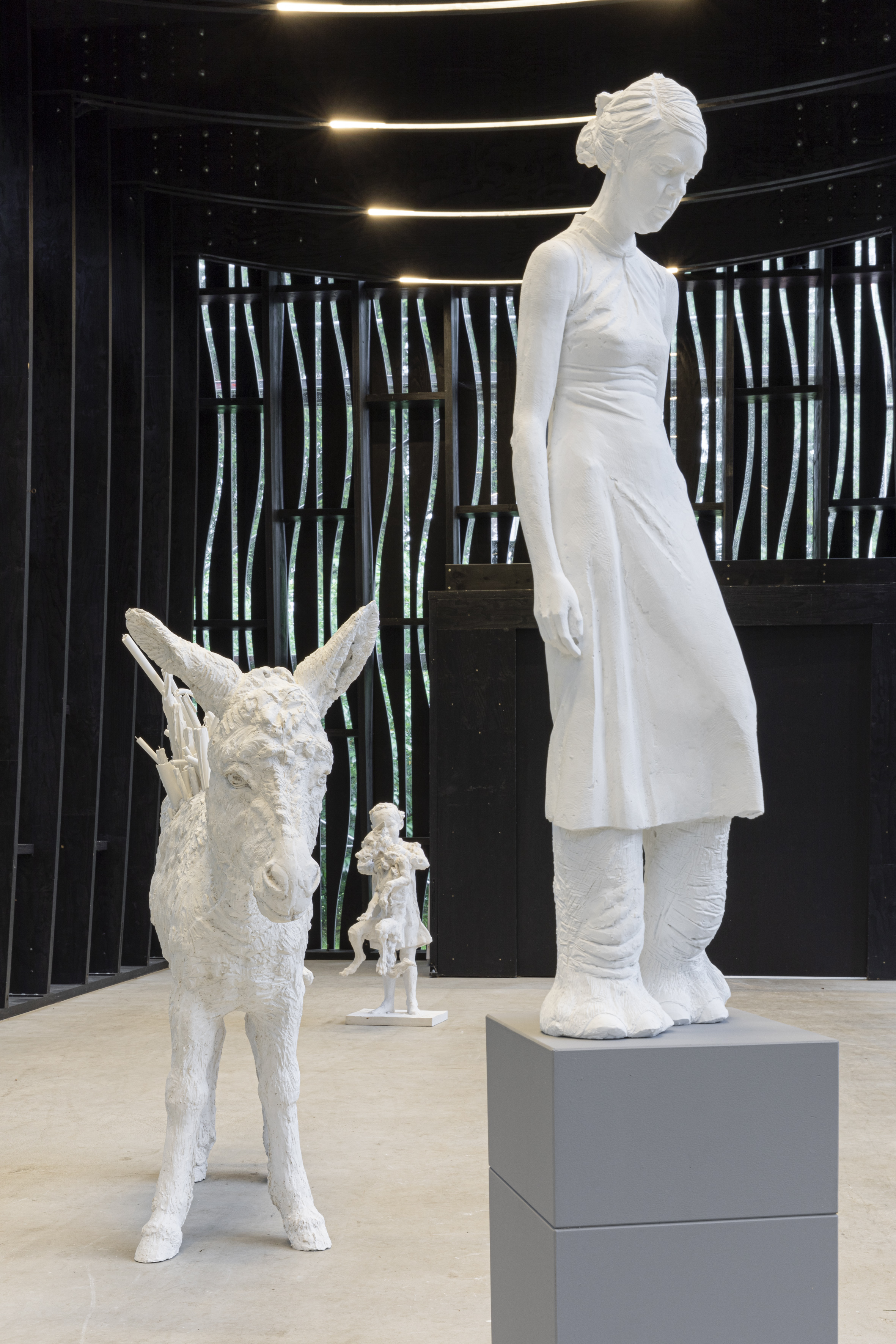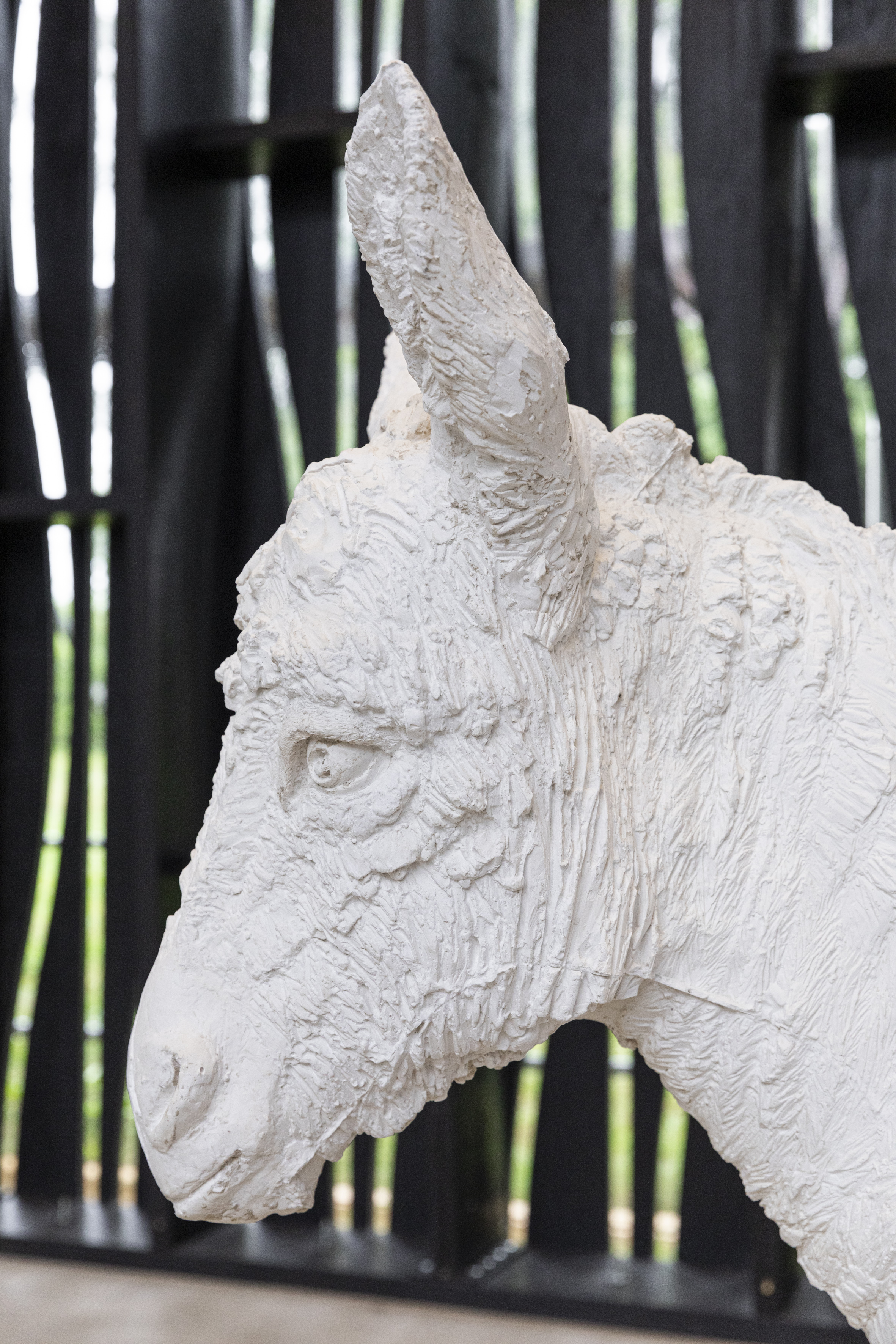Im Gartenpavillon des Klosters hat Härtel ein Ensemble von weißen Gipsfiguren wie zu einem Umzug versammelt: Der Esel „Ferdinand“, der der Installation den Namen gibt, trägt Kerzen auf seinem Rücken, die hell zu brennen scheinen. Vor ihm ein Mädchen, anmutig schön, mit den schweren Füßen eines Elefanten. Hinter ihm ein anderes, „Eloise“, das einen Wolf wie eine erlegte Beute würgend am Hals gepackt hat. Dieses Ensemble komplettiert „Rapunzel“, umrundet von ihren zu Boden fallenden Zöpfen. Mensch und Tier in jener „Perlenkette einer Traumwelt“, wie die Künstlerin sagt, „einer surrealen Prozession“ verknüpfen sich zu einer Geschichte. Am Ort der bis vor wenigen Jahren hier lebenden Salesianerinnen setzt Härtel weibliches Selbstbewusstsein und Stärke ins Bild und mit dem Tier ein Sinnbild der Hoffnung auf eine humane Welt.