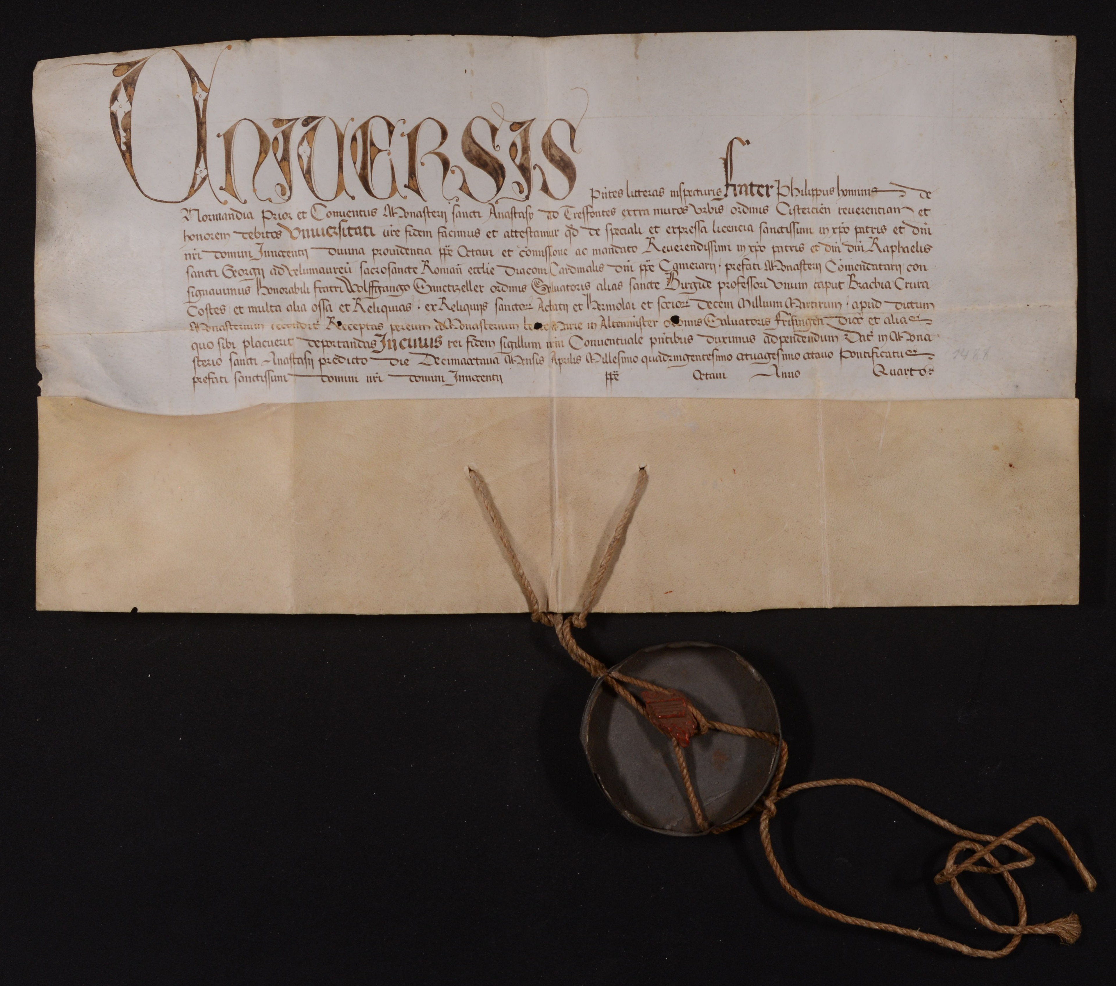 - Schenkung von Reliquien für das römische Zisterzienserkloster Tre Fontane an das künftige Kloster Altomünster; Pergament-Urkunde mit Rest eines in Metallhülle anhängenden Siegels; Rom, 1488