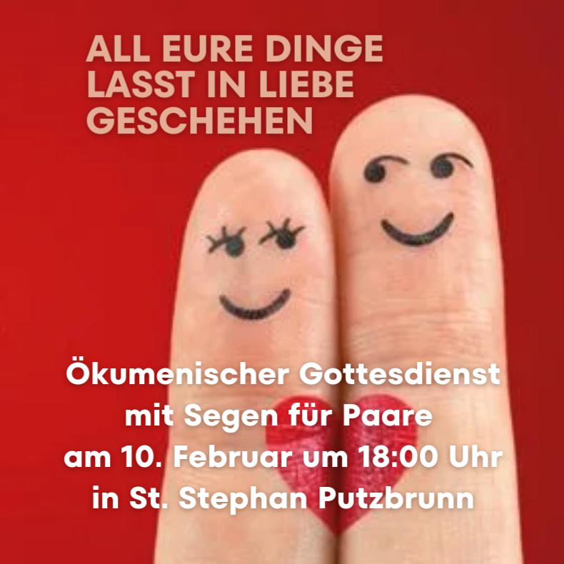 | | Sehr geehrte Empfängerinnen und Empfänger unseres Newsletters, mit diesem Newsletter möchten wir Sie auf Folgendes hinweisen: Heute am Freitag, 09.02.2024 findet ab 20:00 Uhr der Fasching der Putzbrunner Pfarrei St. Stephan statt. Wir freuen uns über Ihr Kommen. Herzliche Einladung zum Ökumenischen Gottesdienst zum Valentinstag am Samstag, 10.02.2024, um 18:00 Uhr, nach St. Stephan – Putzbrunn.