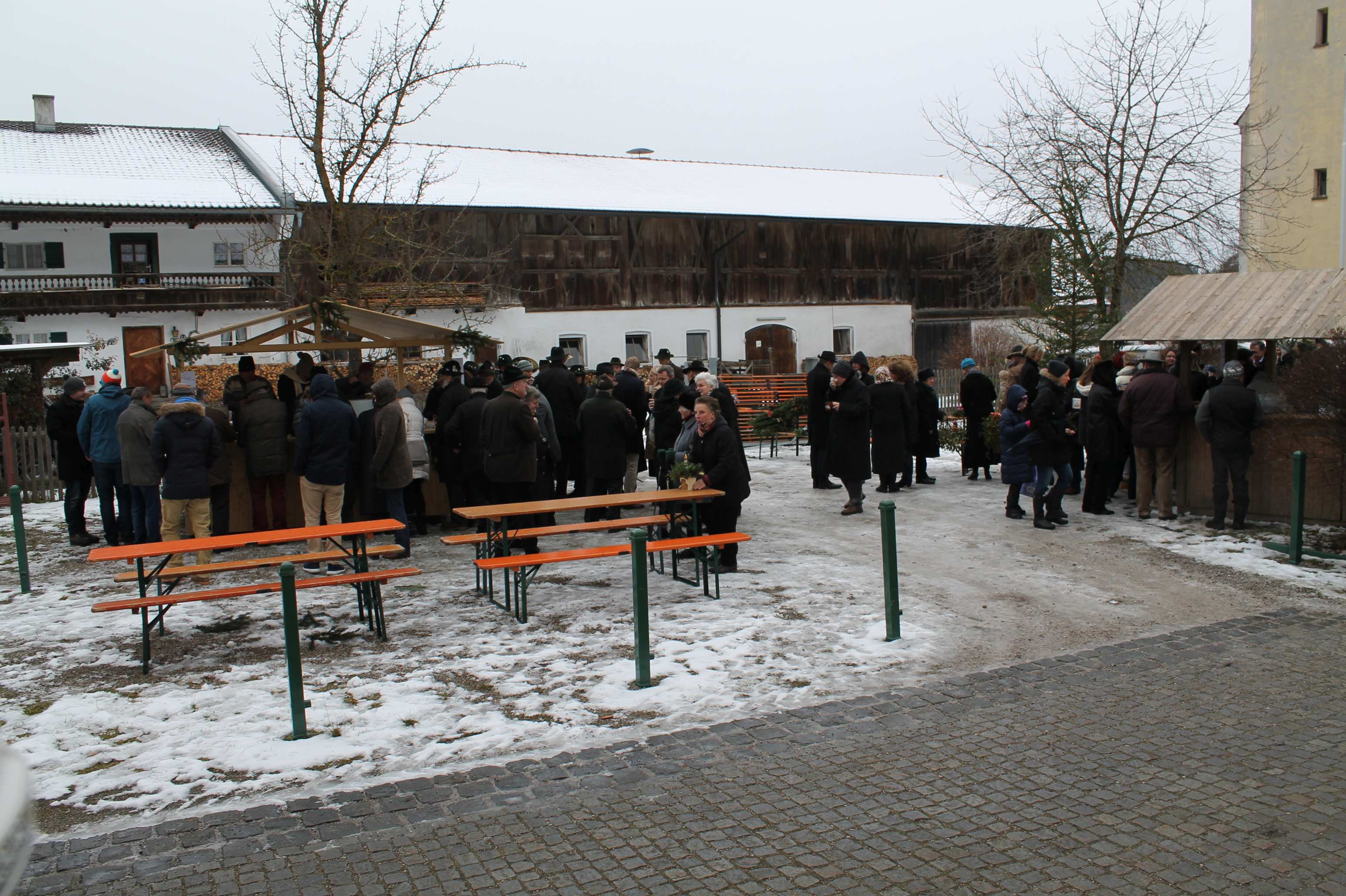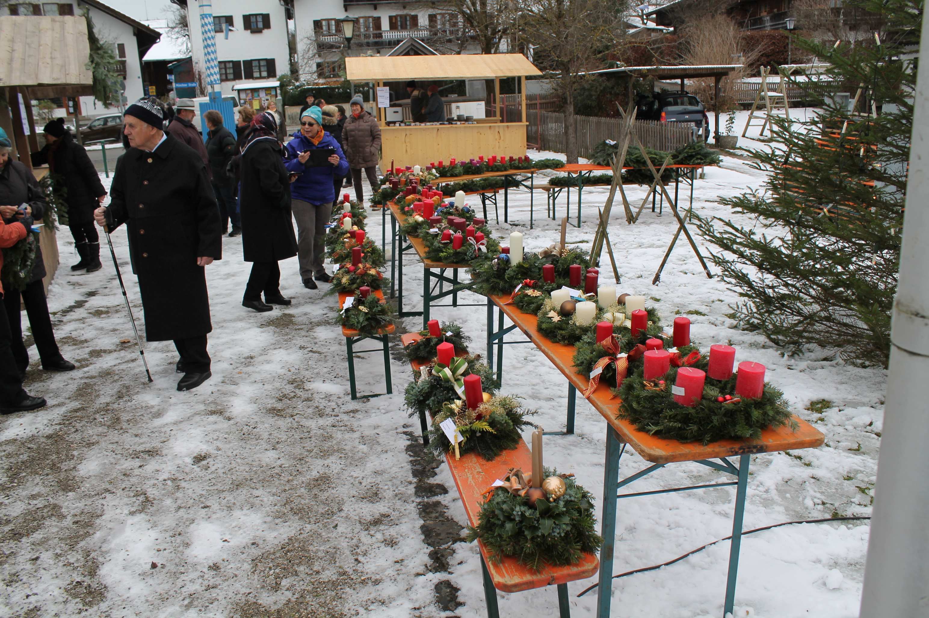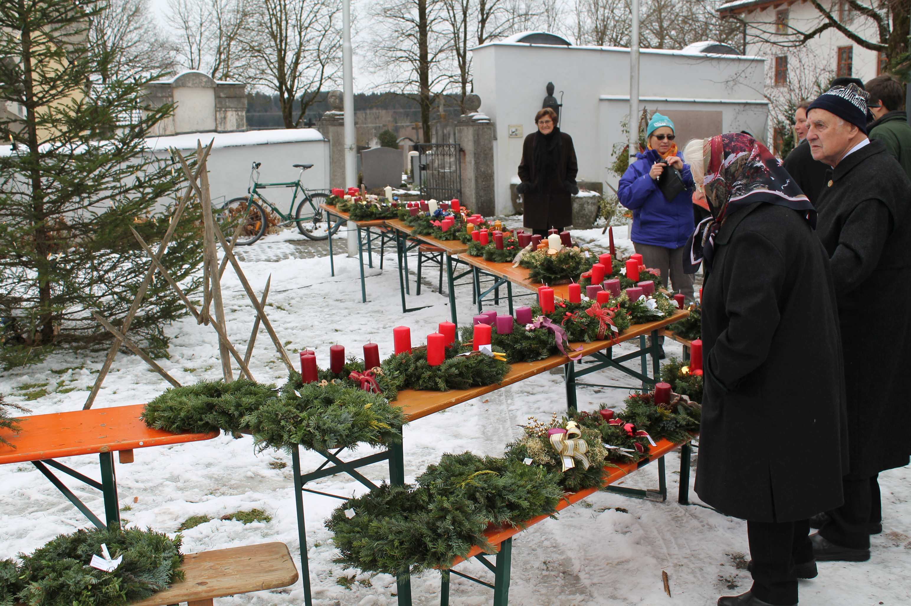 Nach der Weihe der Kränze und Gestecke durch Pfr. Manfred Wurzer konnten sich die Besucher bei winterlichem Wetter und besinnlichen Weisen der Bläser auf die adventliche Zeit einstimmen. Der Erlös kam der Kirchenrenovierung zugute.