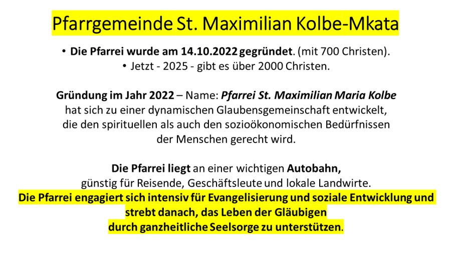 Die Pfarrkirche St. Maximilian Kolbe in Mkata hatte so schlechte Fundamente, dass die geplante Erweiterung nicht möglich war und zuerst das Fundament neu gelegt werden musste. Die Kirche soll neu und größer gebaut werden, da die Pfarrei stark wächst. Innerhalb von 3 Jahren wuchs die Mitgliederzahl von 700 auf über 2000 im Jahr 2025.