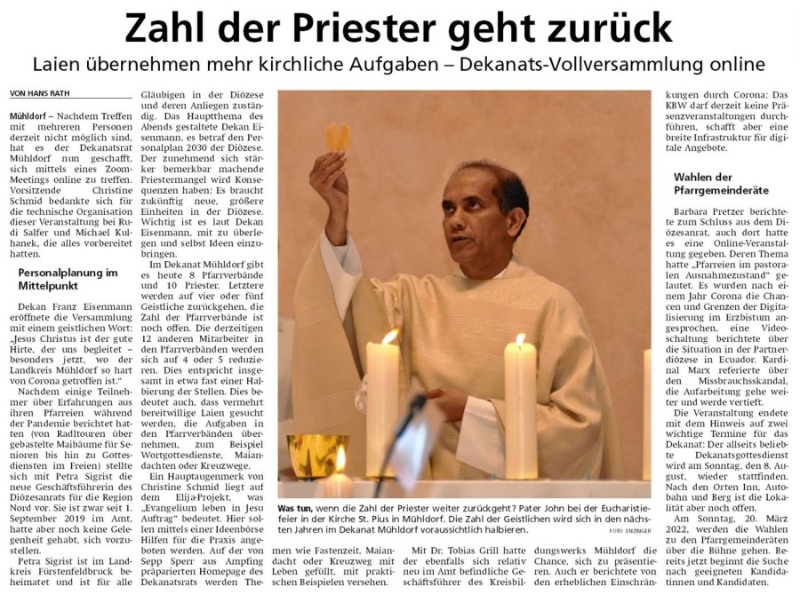 Am Mittwoch, 28. April 2021 traf sich der Dekanatsrat zur Frühjahrsvollversammlung. Aufgrund der Coronapandemie fand die Versammlung in einer Videokonferenz statt. Auf der Tagesordnung standen folgende Punkte: