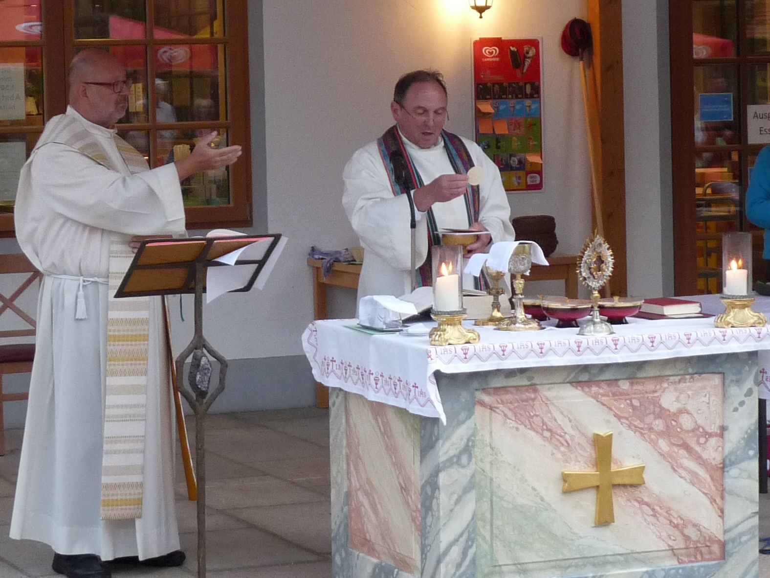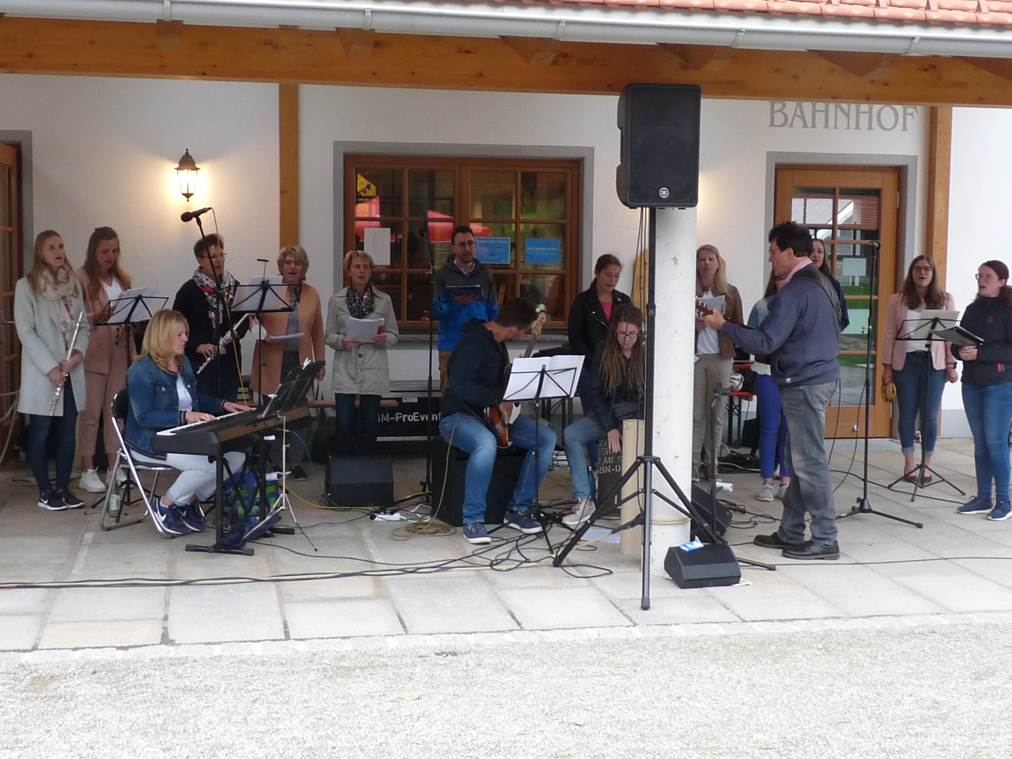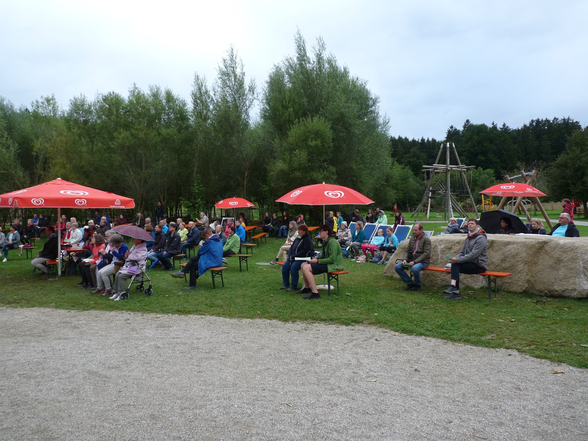 Auch heuer feierten die Dekanate Mühldorf und Waldkraiburg wieder einen Gottesdienst unter dem Motto "Lust auf Leben - heute spür ich Dich" an einem ungewöhnlich Ort, im Wildpark Oberreith. Aufgrund der unsicheren Wetterlage kamen diesmal nur 130 bis 140 Gottesdienstteilnehmer. Ursprünglich war geplant, den Gottesdienst mit Blick auf die Kapelle zu feiern. Da es aber evtl. regnen könnte, wurde der Altar unter dem Dach am Bahnhof aufgebaut.
