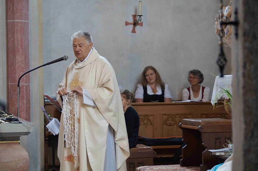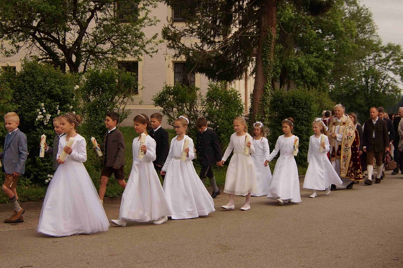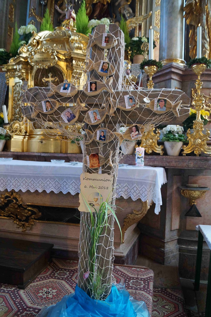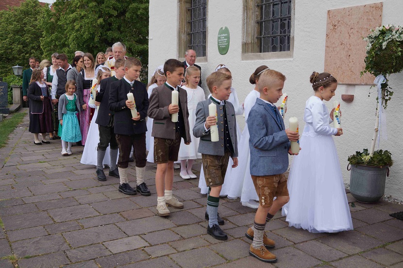 Angeführt von der Musikkapelle Weildorf marschierten die Kinder am Morgen mit dem Altardienst, ihren Eltern und ihren Geschwistern von der Grundschule zur Kirche. Im Portal entzündeten die Mesnerleute die Kerzen, bevor die Kommunionkinder unter feierlichem Orgelspiel in das festlich geschmückte Gotteshaus einzogen. Fast alle Lehrkräfte der Grundschule waren gekommen und die Schüler der vierten Klasse unterstützten die jüngeren Mitschüler kräftig beim Singen der schönen, modernen Lieder. Instrumental begleitet wurden sie von Lehrerin Christine König an der Gitarre und Viertklässlerin Marlena Stadler an der Querflöte. Nach dem Glorialied „Laudato si“ las eine Kommunionmutter Worte über das Leben der jungen Gemeinde aus der Apostelgeschichte vor. Beim Lied „Gottes Liebe ist so wunderbar“ wurde kräftig mitgesungen, bevor Geistlicher Rat Pfarrer Horst Kreß frei und kindgerecht aus dem Johannesevangelium erzählte, wie die Jünger auf den Rat von Jesus zum Fischen auf den See fuhren und ein Netz voll mit Fischen zurückbrachten. In der Vorbereitungszeit für die Erstkommunion hatten die Kommunionmütter mit Hilfe der Väter anstatt eines Plakates ein schönes Kreuz aus Holz gebaut. Für jedes Kind war ein Holzfisch mit Foto und Namen angebracht worden, der symbolisch mit einem Netz gehalten wurde. Darauf bezog sich der Pfarrer in seiner Predigt. Die Kinder seien in dem Netz nicht eingesperrt, sondern könnten sich darin frei bewegen, erklärte er. Unter seinem Zaubertuch hatte er ein Netz verborgen, das er sich extra von den Fußballern ausgeliehen hatte. Vom Kindergarten hatte er sich dazu verschiedene Bausteine besorgt, die er mit Unterstützung der Kommunionkinder in das Netz legte. Sie symbolisierten gute Vorschläge dafür, was man zum Leben braucht. Wichtig sei die Zufriedenheit, das Annehmen aller Menschen wie sie sind, verzeihen zu können und dankbar zu sein. Ein weiterer Baustein sei, das Leben gemeinsam zu leben mit gegenseitigem Geben und Nehmen. Beim Beten könne man Gott alles sagen und die Kommunionkinder dürfen in Zukunft nun auch am Mahl teilnehmen, wenn sie im Gottesdienst etwas über Gott hören. Ein Baustein blieb übrig. Der wurde auf den Vorschlag eines Kommunionmädchens und seiner Lehrerin schließlich als Sinnbild für die Liebe und die Freundschaft in das Netz gepackt. Einige Kommunionkinder trugen nach dem Glaubensbekenntnis die Fürbitten vor, andere durften den Altar für die Mahlgemeinschaft vorbereiten. Zur Gabenbereitung und zum Sanktus stimmten die Kinder wieder moderne rhythmische Lieder an. Auch das „Vaterunser“ wurde gesungen. Die Kirche wurde zum Abendmahlsaal, als die ganze Kirchengemeinde in das Gottesloblied „Beim letzten Abendmahle“ einstimmte. Dann wurde es still im Raum und die Kinder empfingen zum ersten Mal den Leib Christi. Mit „Nun danket alle Gott“ drückte die ganze Glaubensgemeinschaft anschließend an die Kommunion ihre Dankbarkeit aus und den verstorbenen Angehörigen wurde das schöne Irische Segenslied „Möge die Straße uns zusammenführen“ gewidmet. Nach dem Schlusslied „Egal was kommt“ und dem Auszug aus der Pfarrkirche hatte der Pfarrgemeinderat einen Stehempfang im Pfarrheim vorbereitet.