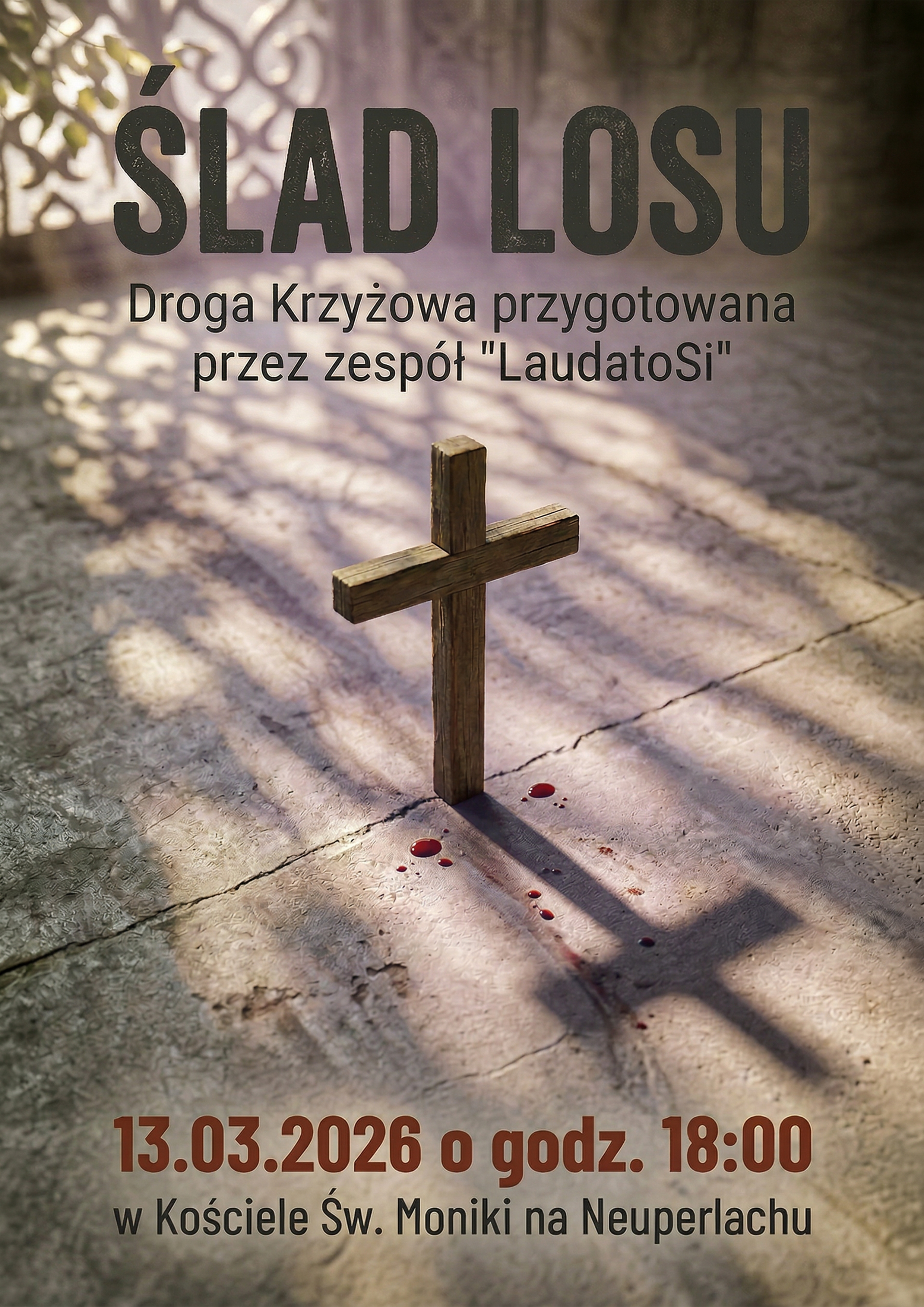 Zespół „Laudato Si” serdecznie zaprasza wszystkich na nabożeństwo Drogi Krzyżowej, które odbędzie się wyjątkowo o godzinie 18.00 w kościele św. Moniki na Neuperlachu w najbliższy piątek (13.03). Zespół wykona redemptorystowską drogę krzyżową pt. "Ślad losu".