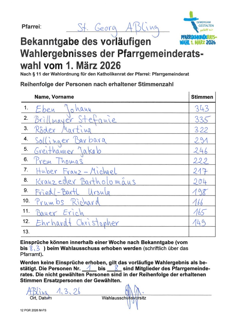 In Aßling gibt es in dieser Wahlperiode leider keinen Pfarrgemeinderat.