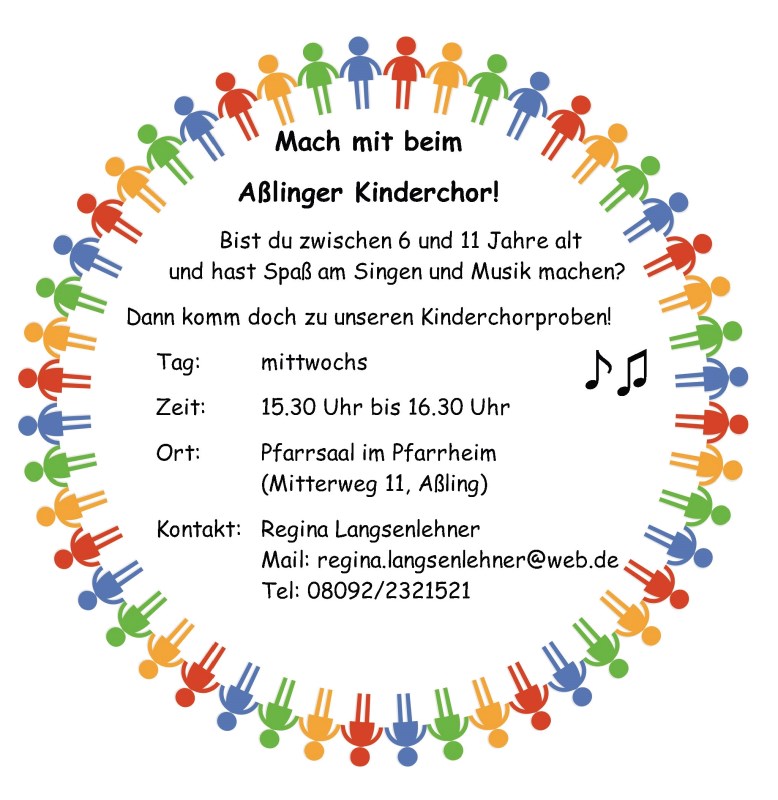 Seit Januar 2019 treffen sich um die 20 begeisterte Vorschul- und Grundschulkinder unter der Leitung von Regina Langsenlehner einmal wöchentlich im Pfarrzentrum Aßling zur Kinderchorprobe. Gesungen werden schwungvolle und ruhige Kirchenlieder, lustige Kinderlieder, Kanons und Sprechstücke. Vieles wird mit Körperinstrumenten oder mit Bewegungen begleitet. Manche Ohrwürmer werden auch zu Hause leise gesummt oder lautstark vorgetragen – egal, ob religiöse oder weltliche Musik.