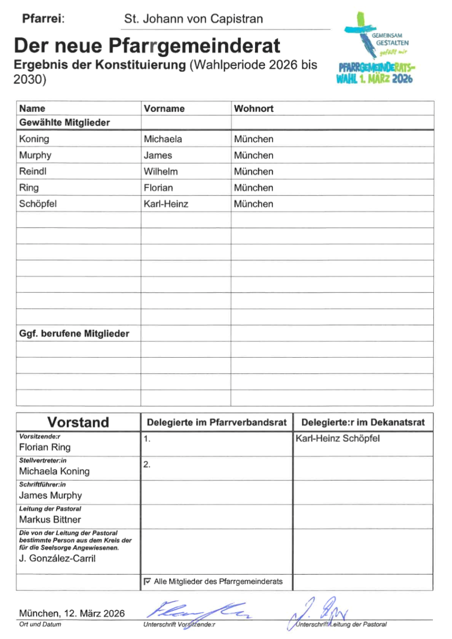 Pfarrgemeinderatswahl im Pfarrverband Bogenhausen Süd - Ergebnis der Konstituierung