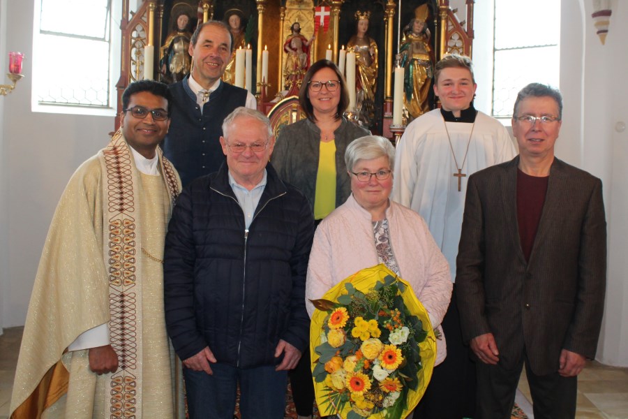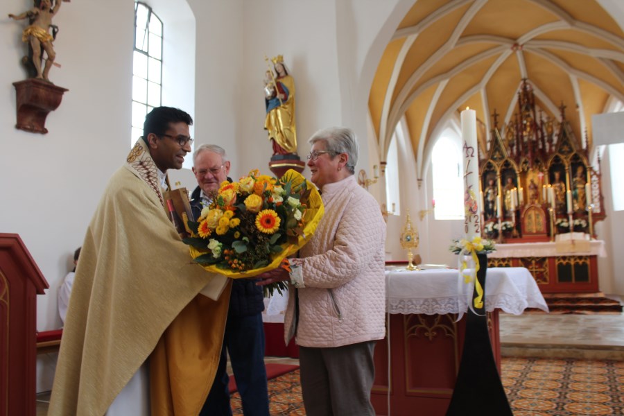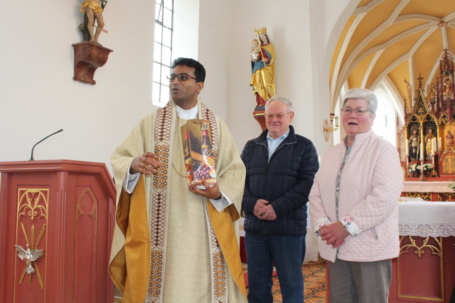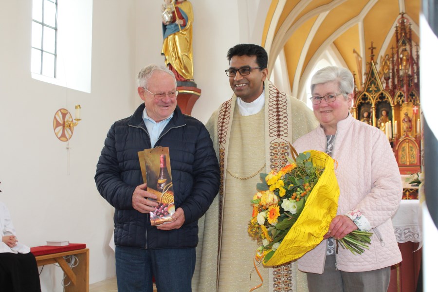 Am Samstag feierten bei einem Gottesdienst in St. Stephanus in Attenhausen Hedwig und Paul Kapser ihren Jubeltag der Goldenen Hochzeit. Das Gotteshaus ist neben ihren Familiensitz in der Hochstraße zur zweiten Heimat geworden. Dafür dankte Pater Jis Mangaly mit der ganzen Pfarrgemeinde bei diesem Gottesdienste und überreichte an beide kleine Geschenke zur symbolischen Anerkennung ihrer Tätigkeit. Anhaltender Beifall der zahlreichen Christen in St. Stephanus unterstrich die Dankbarkeit des Volkes für die hervorragenden Tätigkeiten, die beide für die Dorfkirche verrichten.