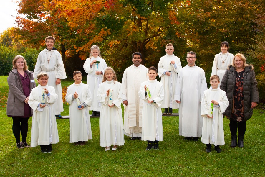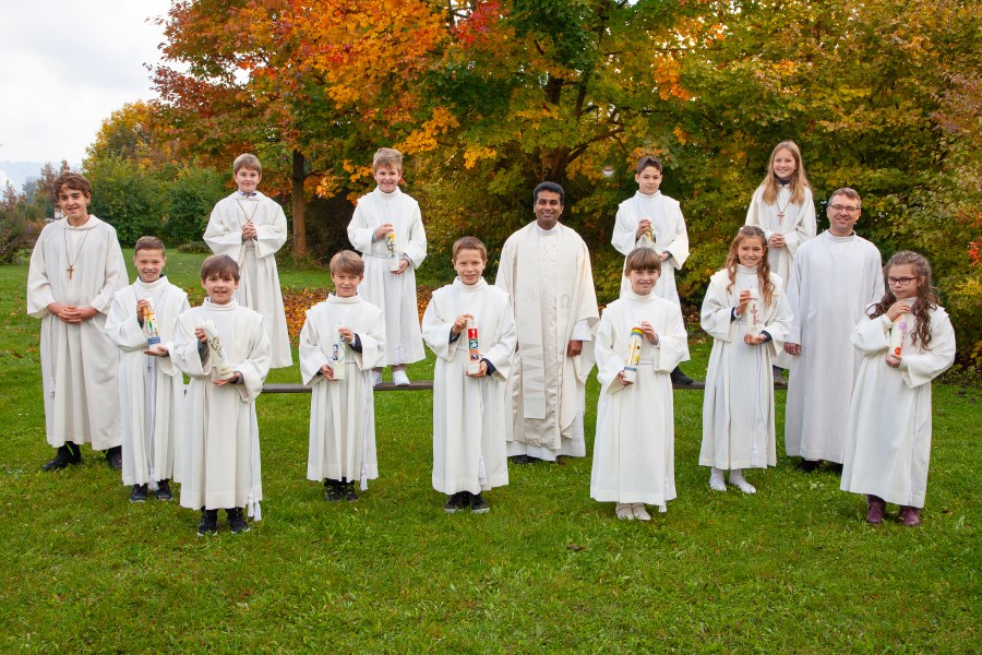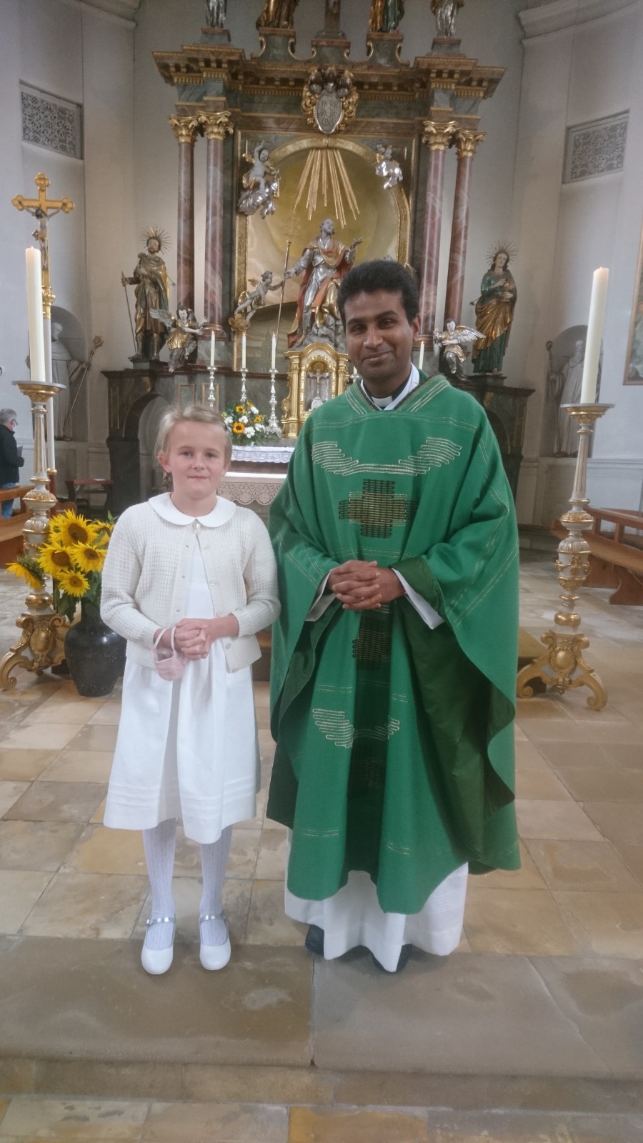 Nach dem Entzünden der Kommunionkerzen hatten die Kinder Gelegenheit, bei den Kyrierufen, den Fürbitten und der Gabenbereitung den feierlichen Gottesdienst aktiv mitzugestalten, bevor sie aus der Hand von Pater Jis Mangaly erstmals die Heilige Kommunion empfingen.