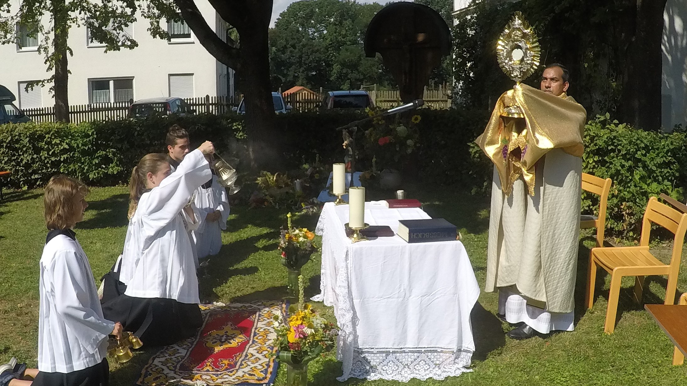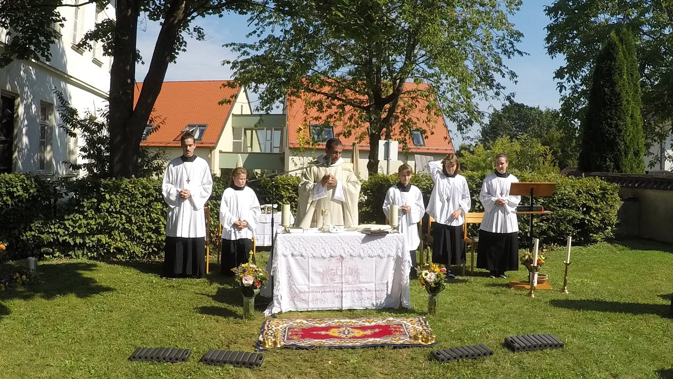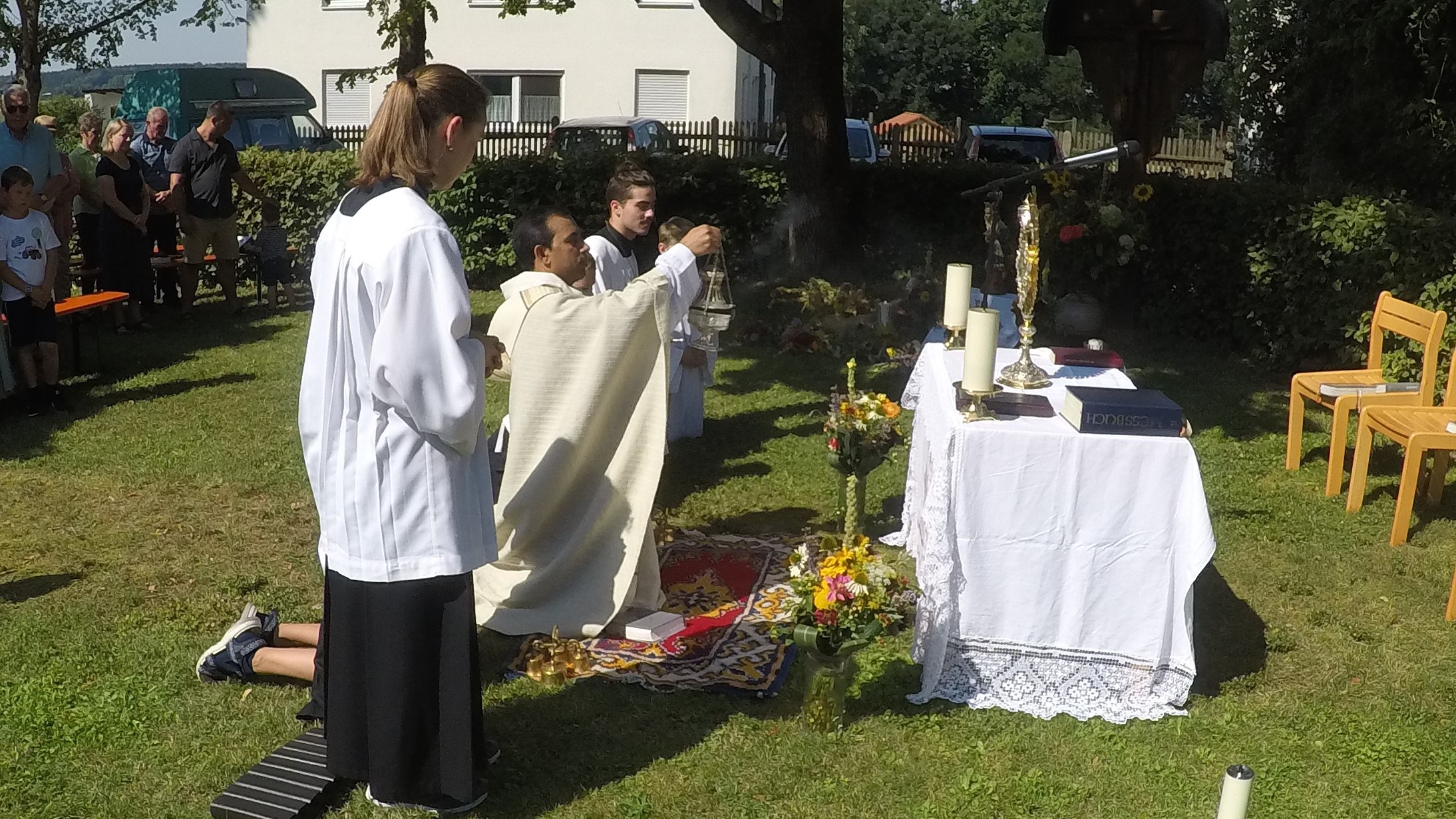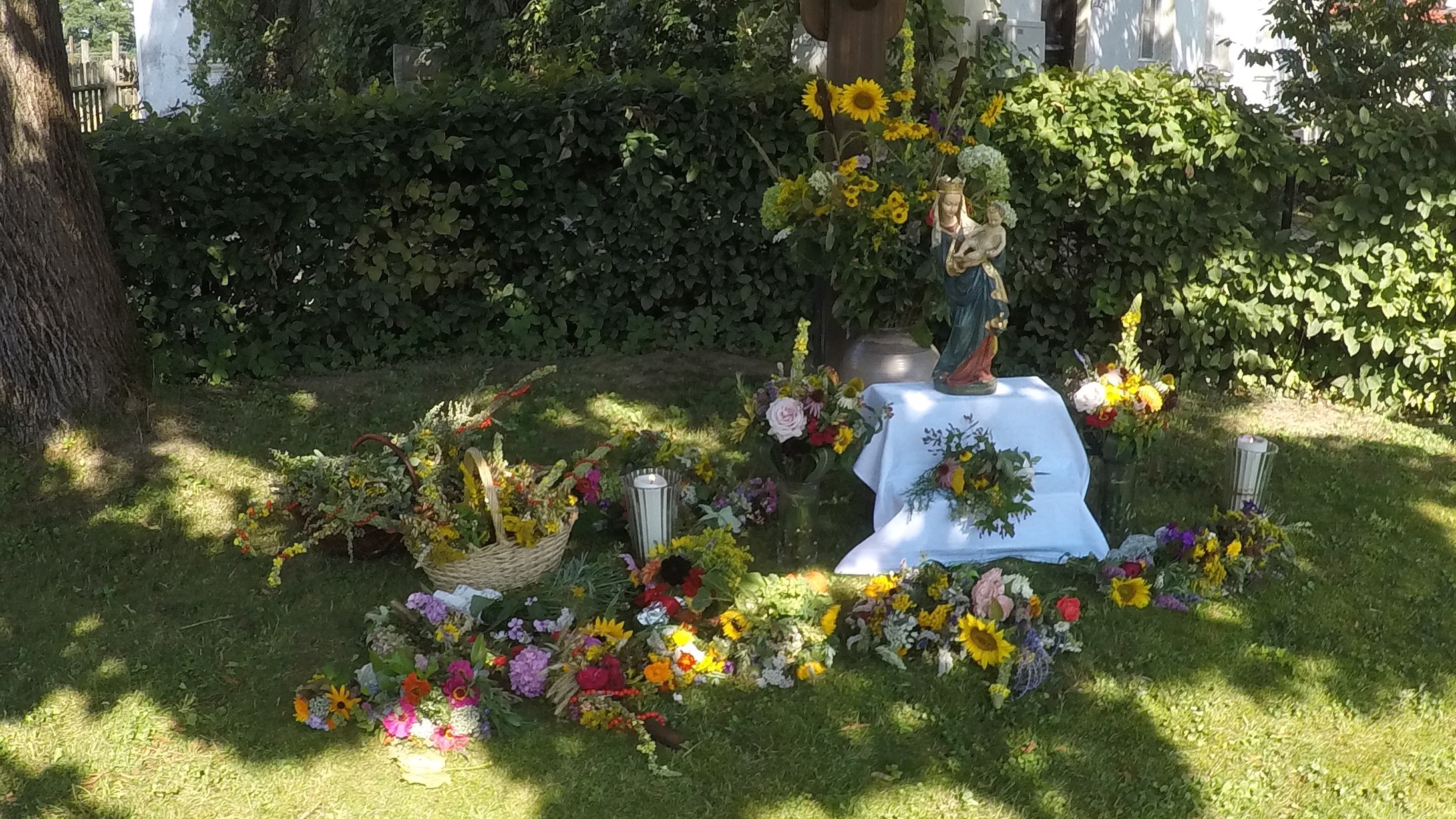 Zahlreiche Gläubige fanden sich bei herrlichem Sonnenschein im Pfarrgarten ein. P. Matthäus zelebrierte die Hl. Messe und segnete die mitgebrachten Kräuterbuschen.