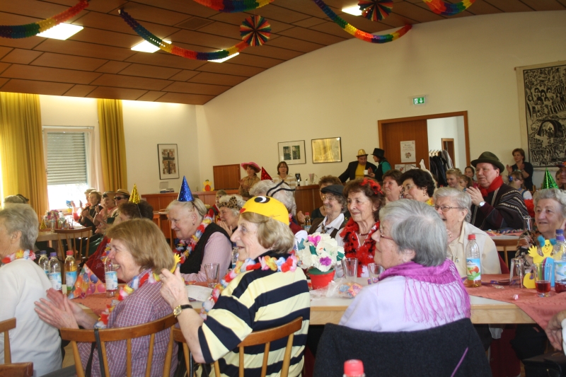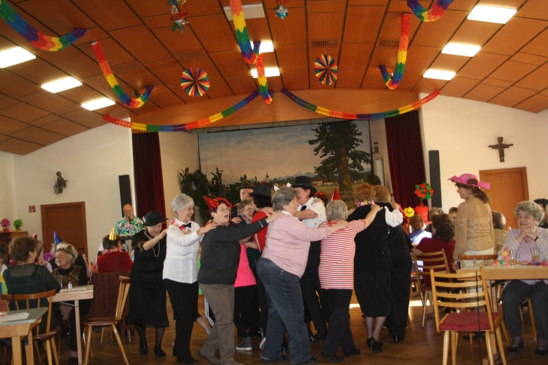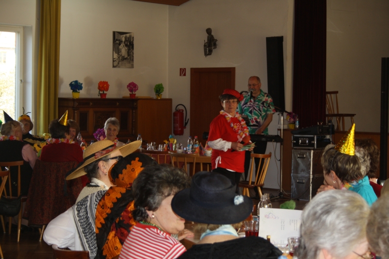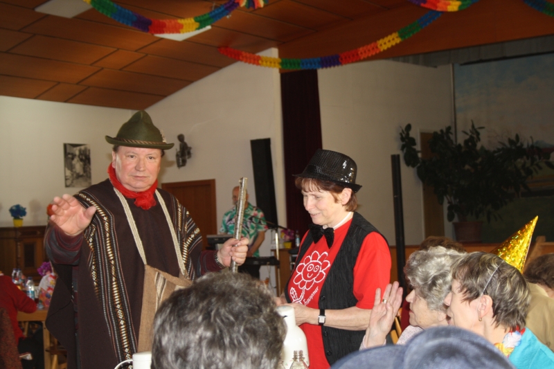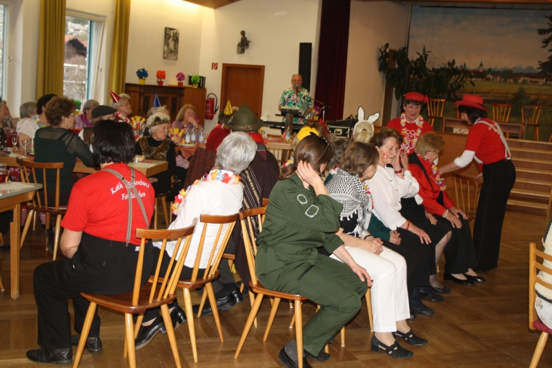 ausmarschieren! Die Frauenbund-Vorstandschaft lud dann zum Konzert der Feldkirchen-Westerhamer „Luftpumpen-Vielharmoniker“ ein und bewies dort ihr musikalisches Talent. Als nächstes Schmankerl gab es noch eine U-Hosen-Modenschau mit französischen Models zu bestaunen. Bei der „Reise nach Jerusalem“ ließ sich auch Pfarrer Dr. Zirdum nicht lumpen und mischte sich eifrig unter die „Pilger“. Zu den flotten Klängen von Musiker Hans aus Sauerlauch wurde außerdem fleißig geschunkelt und getanzt, so dass für alle Maschkera bei dieser Feier etwas geboten war.