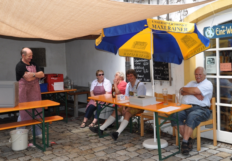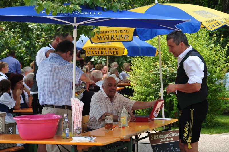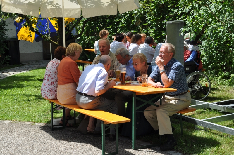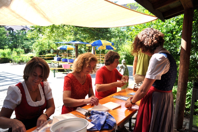 Nur ein kurzer Regenschauer trübte den Besuchern die Vorfreude auf unser Pfarrfest. Und so waren auch gleich wieder die Tische und Bänke im Pfarrgarten abgetrocknet und bereit für den Ansturm der Gäste, die sich mit Brotzeiten, Getränken, mit Kaffee und Kuchen verwöhnen lassen konnten.