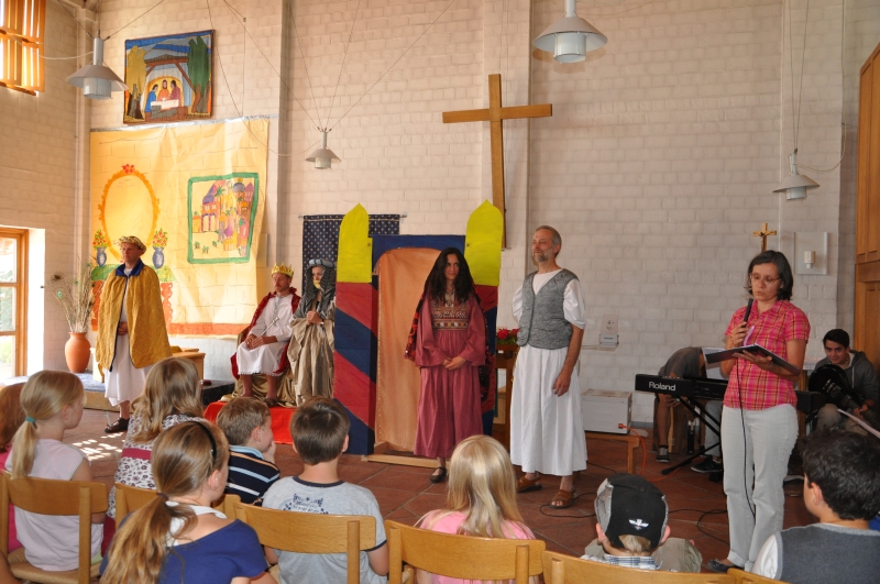 Das spannende Anspiel der biblischen Szenen, das Singen mit der Band und das Basteln in den Gruppen sind laut Umfrage unter den Kindern die Highlights der ökumenischen Kinderbibelwoche, die in der 2. Juliwoche in der Emmauskirche in Feldkirchen stattgefunden hat. Mehr als 100 Kinder durften an 3 Tagen mehr über den Mut der jüdischen Königin Ester erfahren, die durch ihren unerschrockenen und beherzten Einsatz ihr Volk vor einer drohenden Verfolgung bewahrte. Unter der Leitung von Frau Beate Di Mango und Herrn Pfarrer Klaus Meyer sowie 21 Gruppenleiterinnen wurde dann in den Gruppen nacherzählt, Rasseln und Masken gebastelt und gespielt. Wegen der Terminfülle im Juli entschied man sich, gleich am Donnerstag nach dem Gruppenstundennachmittag die Abschlussandacht abzuhalten. Anschließend konnten sich die Kids mit ihren Eltern und Geschwistern im Innenhof der Kirche bei Lagerfeuer mit Fingerfood stärken. Ein herzlicher Dank gilt allen Helfern, Schauspielern, Kuchenbäckerinnen, sowie der mitreißenden KIBIWO-Band.