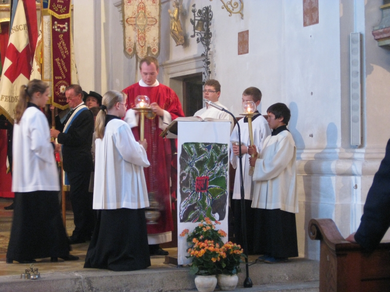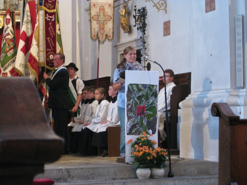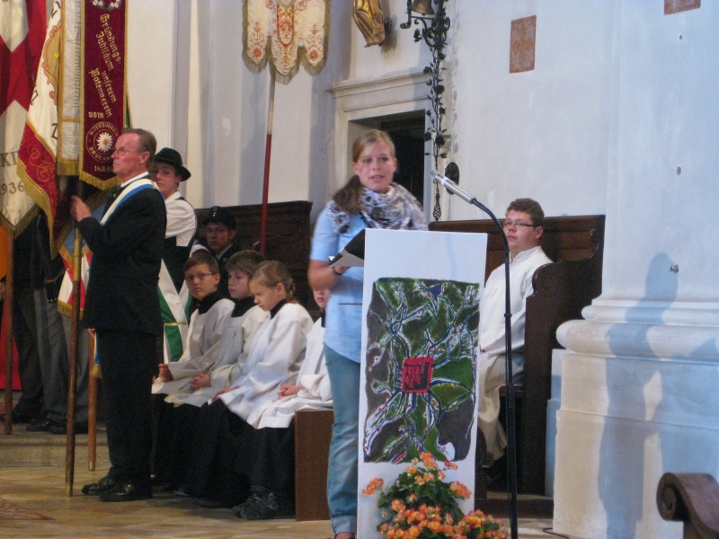Vor der Kollekte berichtete Andrea Schober aus Feldkirchen-Westerham von ihren Plänen im Rahmen des internationalen Freiwilligendienstes der Erzdiözese München und Freising. Die 17-jährige Abiturientin wird ab 28. August ein Jahr im Kinderdorf "Hogar Jesús Nino" in Puerto Rico, Argentinien mithelfen. Sie bedankte sich bei Pater Franz für die großzügige Überlassung eines Teiles der Kollekte des Festgottesdienstes für den Solidaritätskreis des Freiwilligendienstes und bat um weitere Spenden für das Projekt.