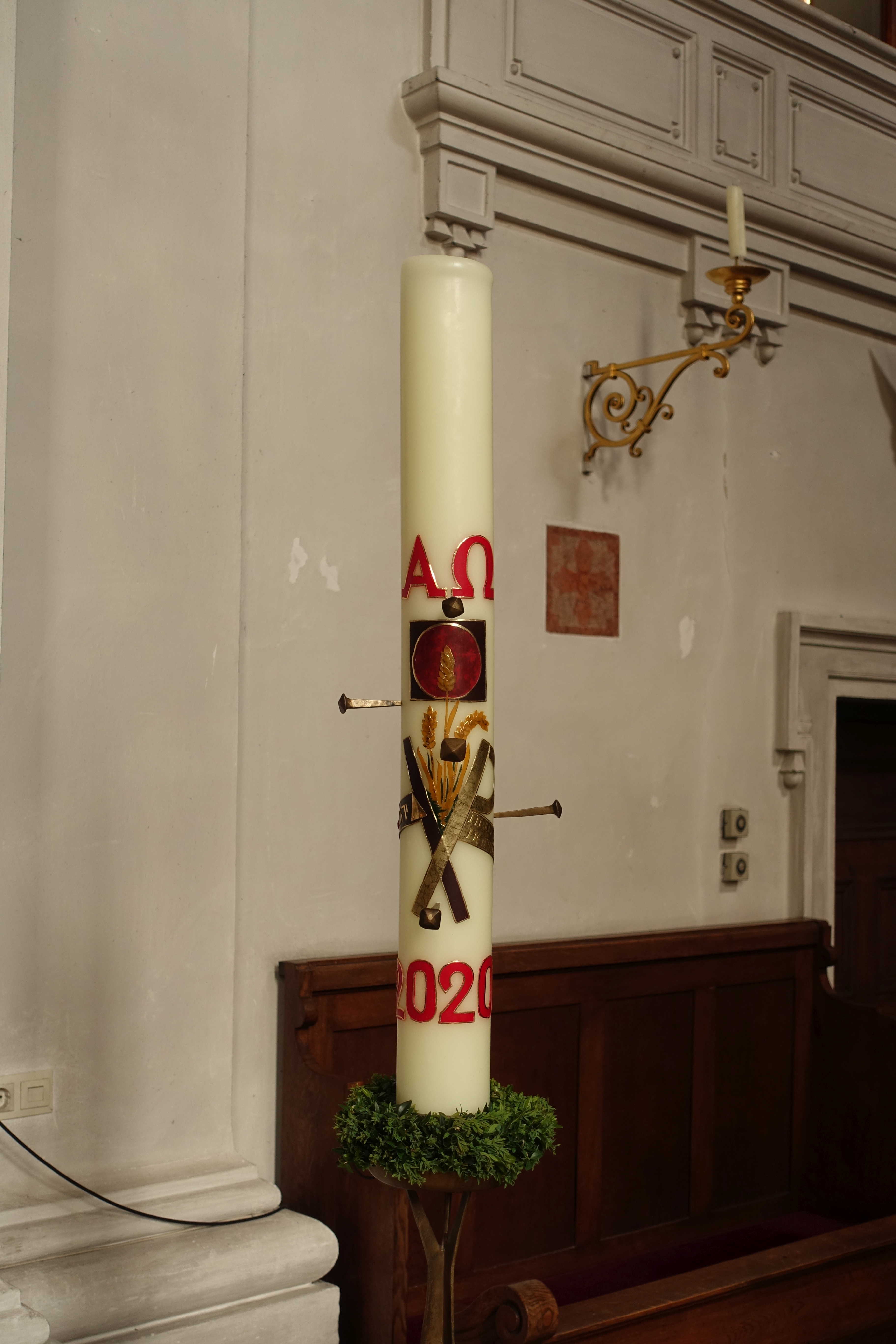 Nun habe ich Ihnen zum besseren Verständnis mit unbeholfenen, ungelenken, einfachen Worten meine Gedanken beim Gestalten der Kerze dargelegt, habe versucht, mich ein wenig dem Geheimnis von Ostern anzunähern.