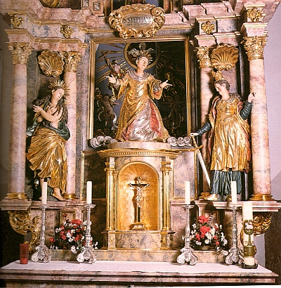 Die Komposition des barocken Hochaltars wurde vom Schongauer Bildhauer Johann Pöllandt (um 1691) angefertigt. Sie zeigt den hl. Diakon Stephanus von Steinen getroffen in die Knie sinkend. Ihm zur Seite sind die beiden Heiligen Magdalena und Katharina gestellt.