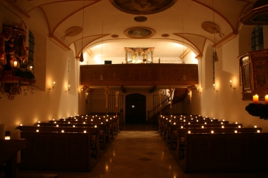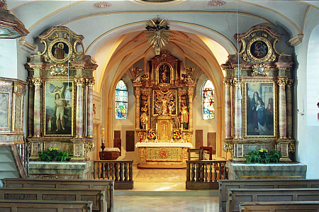 Pfarrer Kraz ließ die Kirche Mitte des 18 Jh. um ein Joch verlängern, zudem von Johann Kempter eine Sakristei anfügen. 1728 setzte man die spätgotische Emporenbrüstung aus Fichtenholz, die von Flachornamentik verziert wird, zurück. Aus der Spätgotik ist zudem noch der Corpus des Chorbogenkreuzes.
