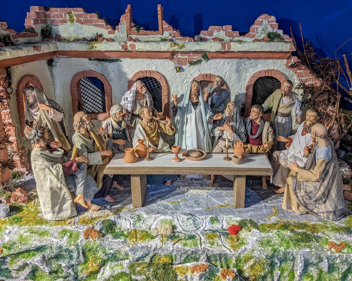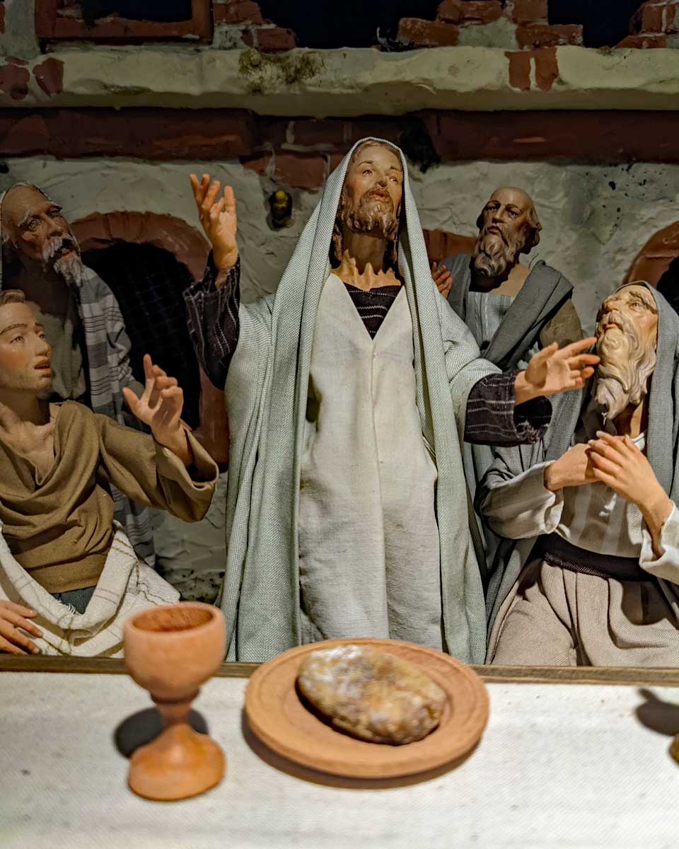 Sie begannen zu essen und da Jesus wusste, dass seine Zeit gekommen war, zu seinem Vater im Himmel zurückzukehren, wurde er plötzlich sehr traurig und verkündete: „Einer von euch hier in der Runde wird mich verraten." Die Jünger waren bestürzt, und einer nach dem anderen fragte ihn: „Du meinst doch nicht mich, Herr?" Als Antwort tauchte Jesus ein Stück Brot ein, gab es Judas und sagte: „Gott allein hat entschieden, was mit mir geschieht." Später nahm Jesus Brot, dankte Gott, brach es in Stücke und reichte es den Jüngern, während er sprach: „Nehmt und esst, das ist mein Leib." Dann nahm er den Weinbecher. „Und trinkt daraus, das ist mein Blut, das für alle Menschen vergossen wird zur Vergebung ihrer Schuld. Macht es als Erinnerung an mich ebenso, wenn ich gegangen bin."