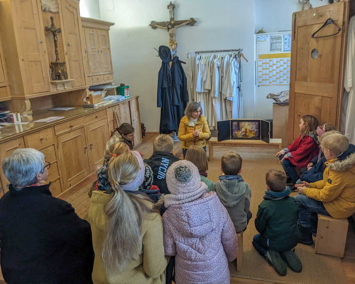 Für das Erzähltheater dürfen die Kinder während der Lesung und der Predigt in die Sakristei kommen. Dort werden die thematischen Elemente des Gottesdienstes bildlich und erzählerisch für die Kinder dargestellt.