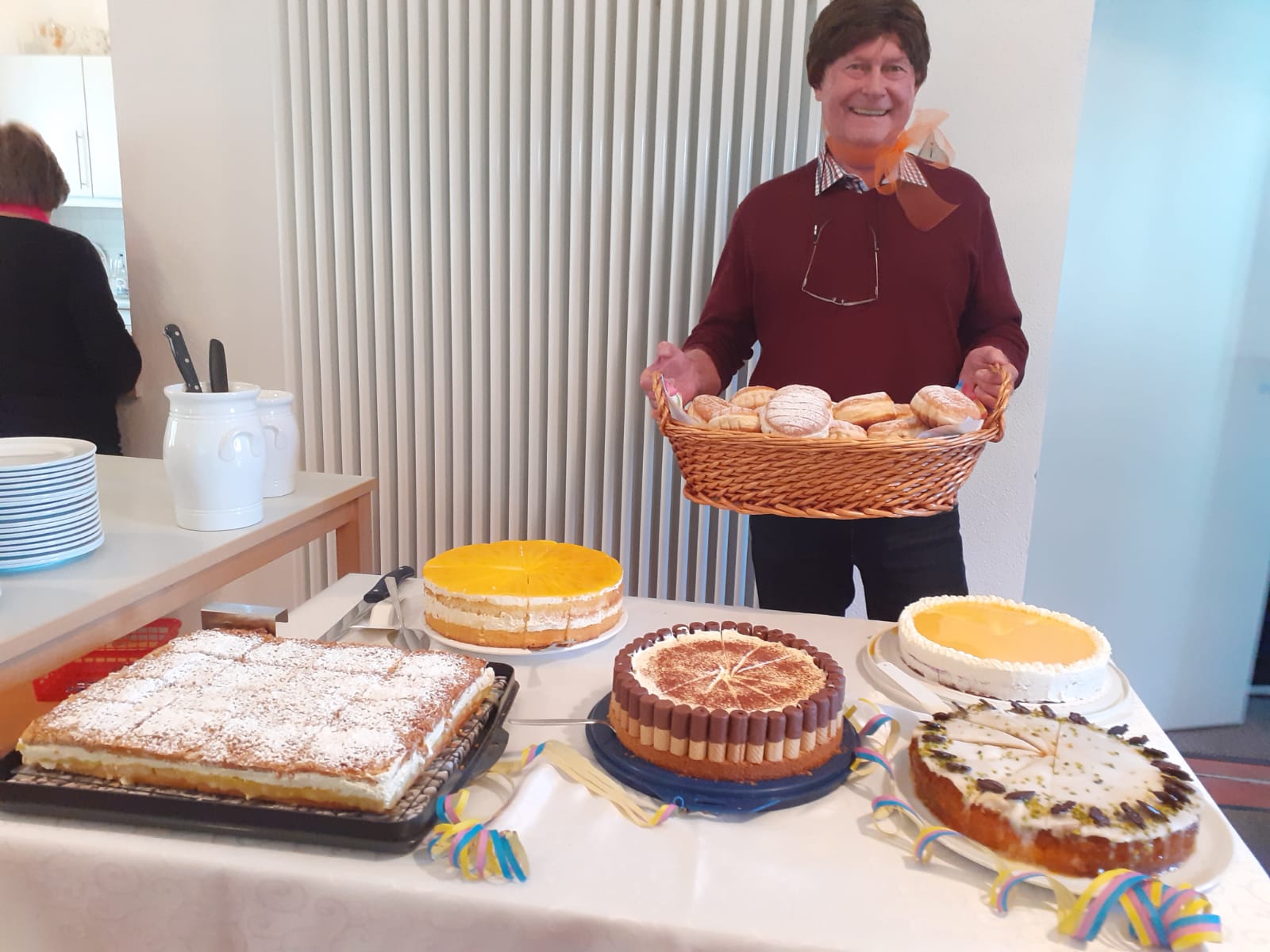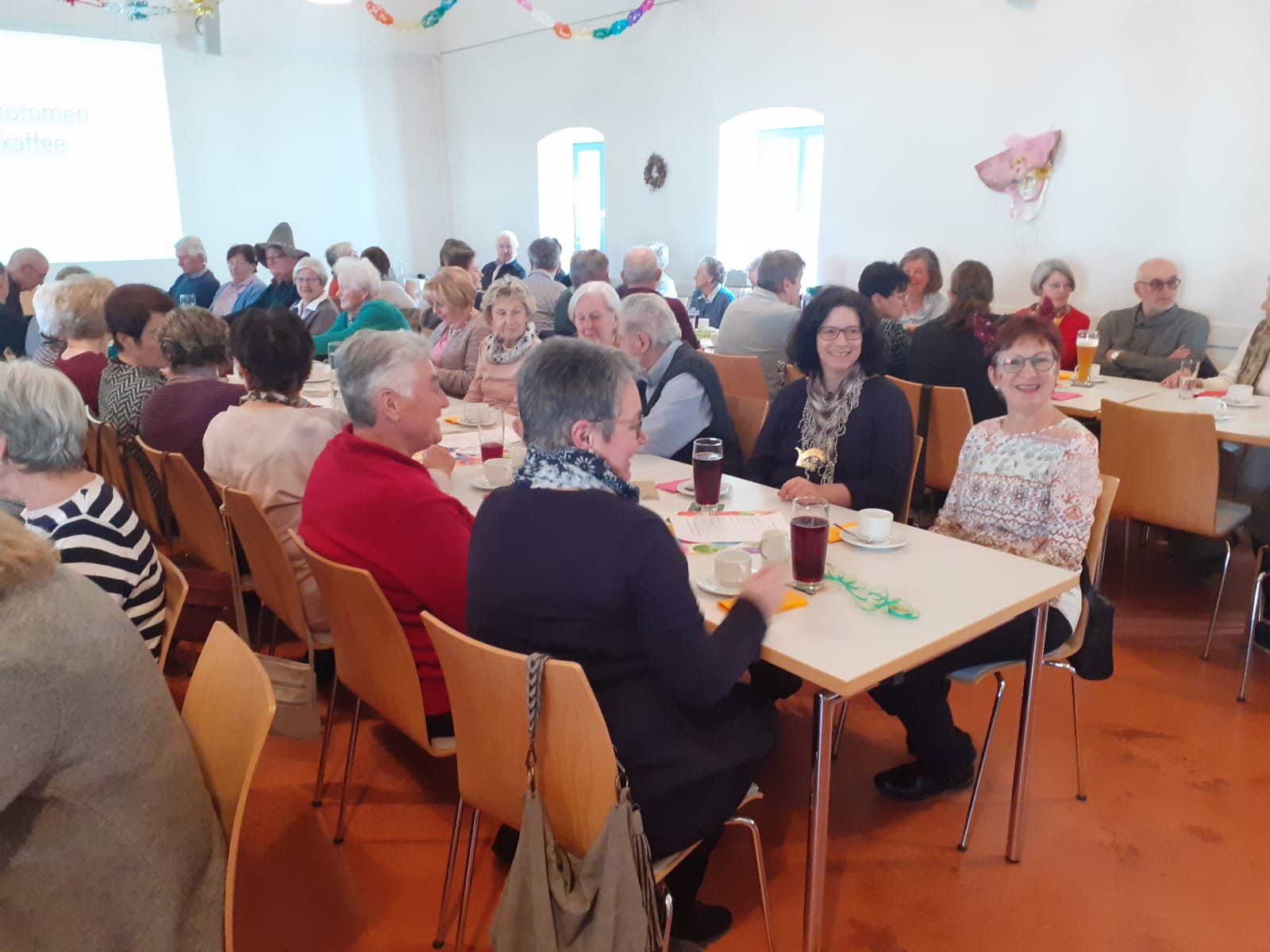Bei Kaffee und Kuchen war die Stimmung schon bestens. Robert Zellner hatte einen Bildervortrag über den Gammelsdorfer Fasching vom Schulfasching 1967 bis zum Fasching 1989 vorbereitet.