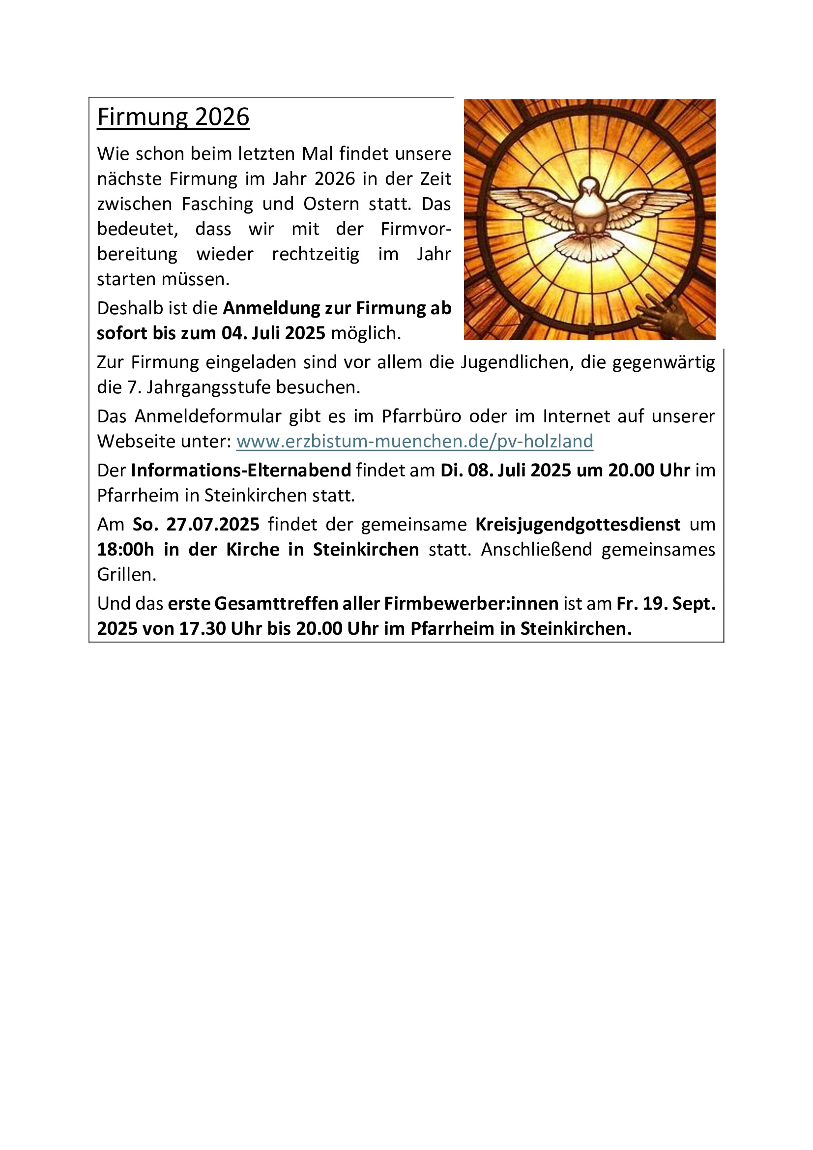 In unserem Pfarrverband werden Jugendliche in der Regel in der 8. Jahrgangsstufe gefirmt. Die Firmung findet im zwischen Fasching und Ostern statt.