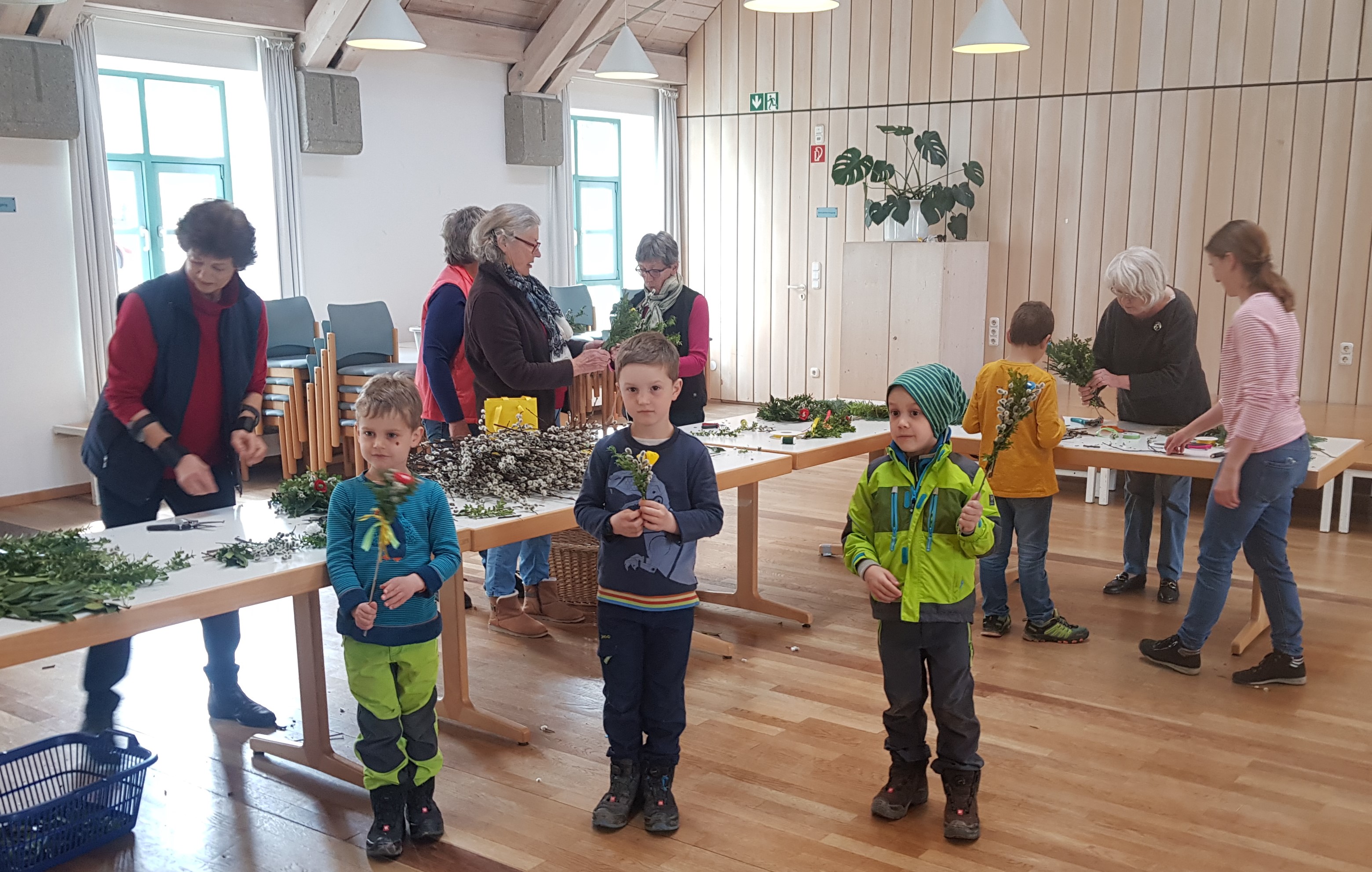Am 1.April (kein Scherz) waren vor 10 Uhr bereits alle Helfer beschäftigt. Die benötigten Materialien (Weidekätzchen, Buchs und andere Materialien) lagen zur Verarbeitung bereit. Auch Kommunion-kinder und -mütter waren eifrig beschäftigt, um liebevoll gestaltete Palmbuschen für den Palmsonntag zu binden.