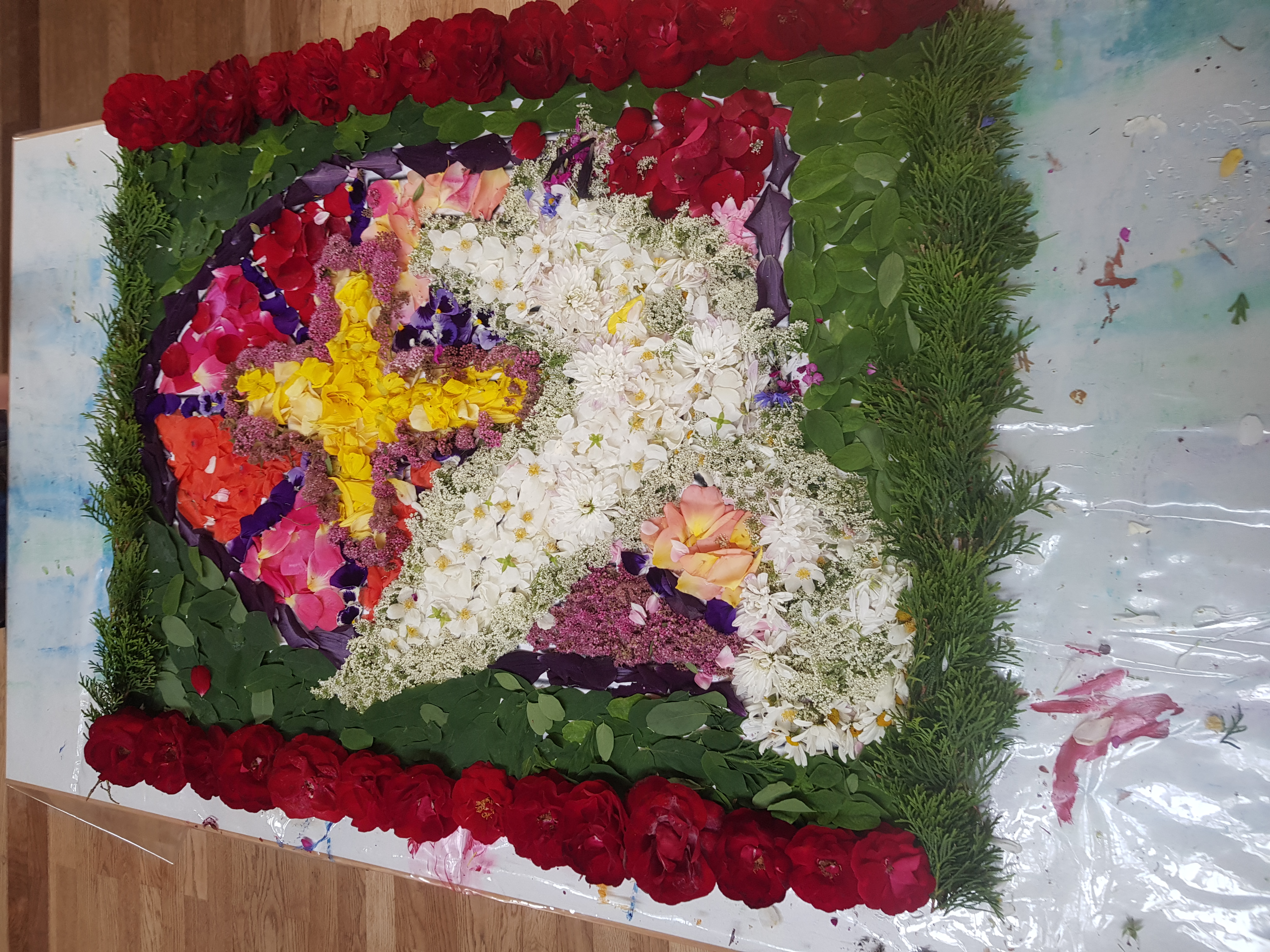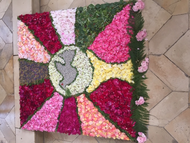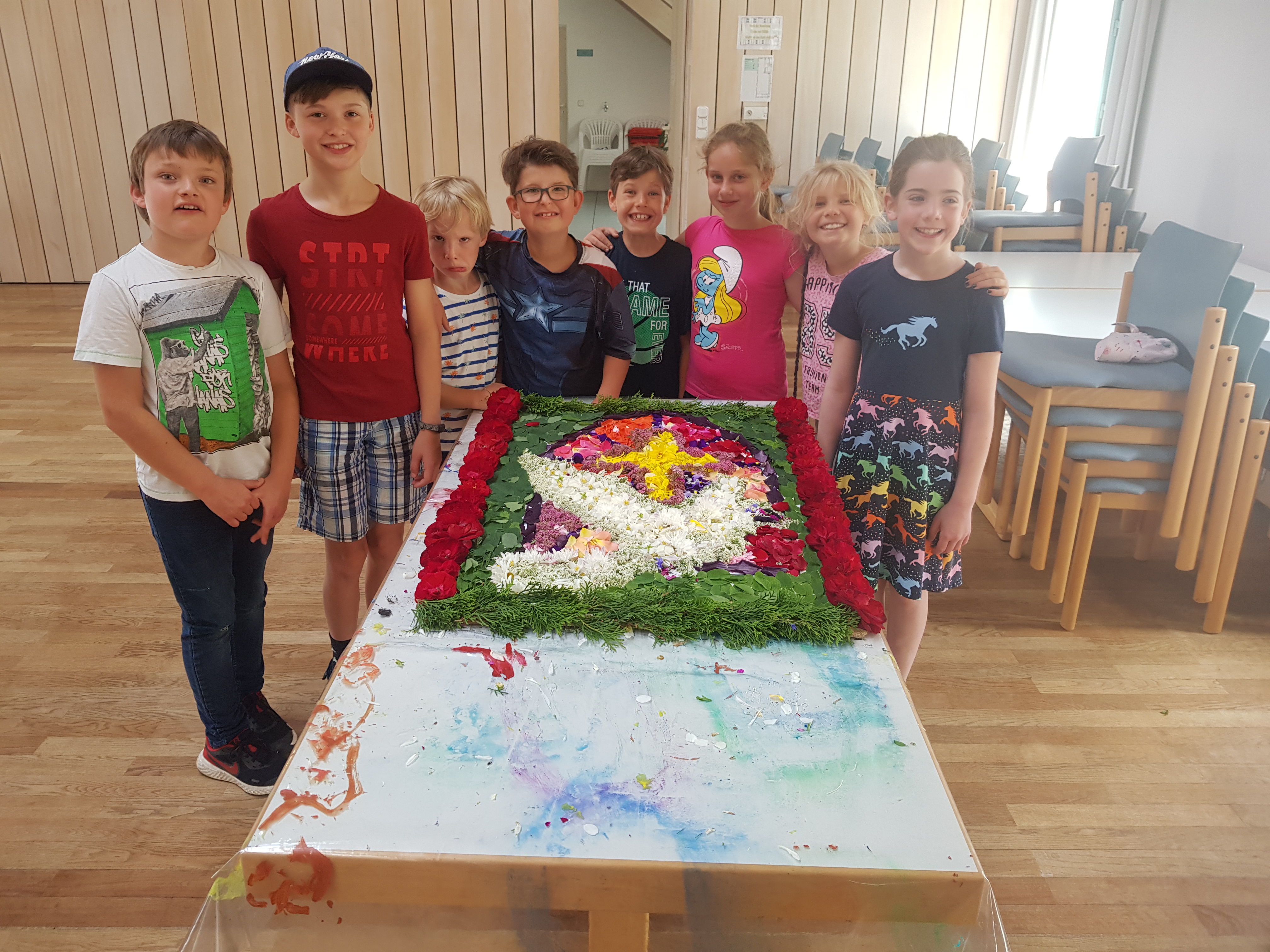 Traditionell wir für den Altar am Rathaus ein Blumenbild von den Kommunionkinder gestalltet.