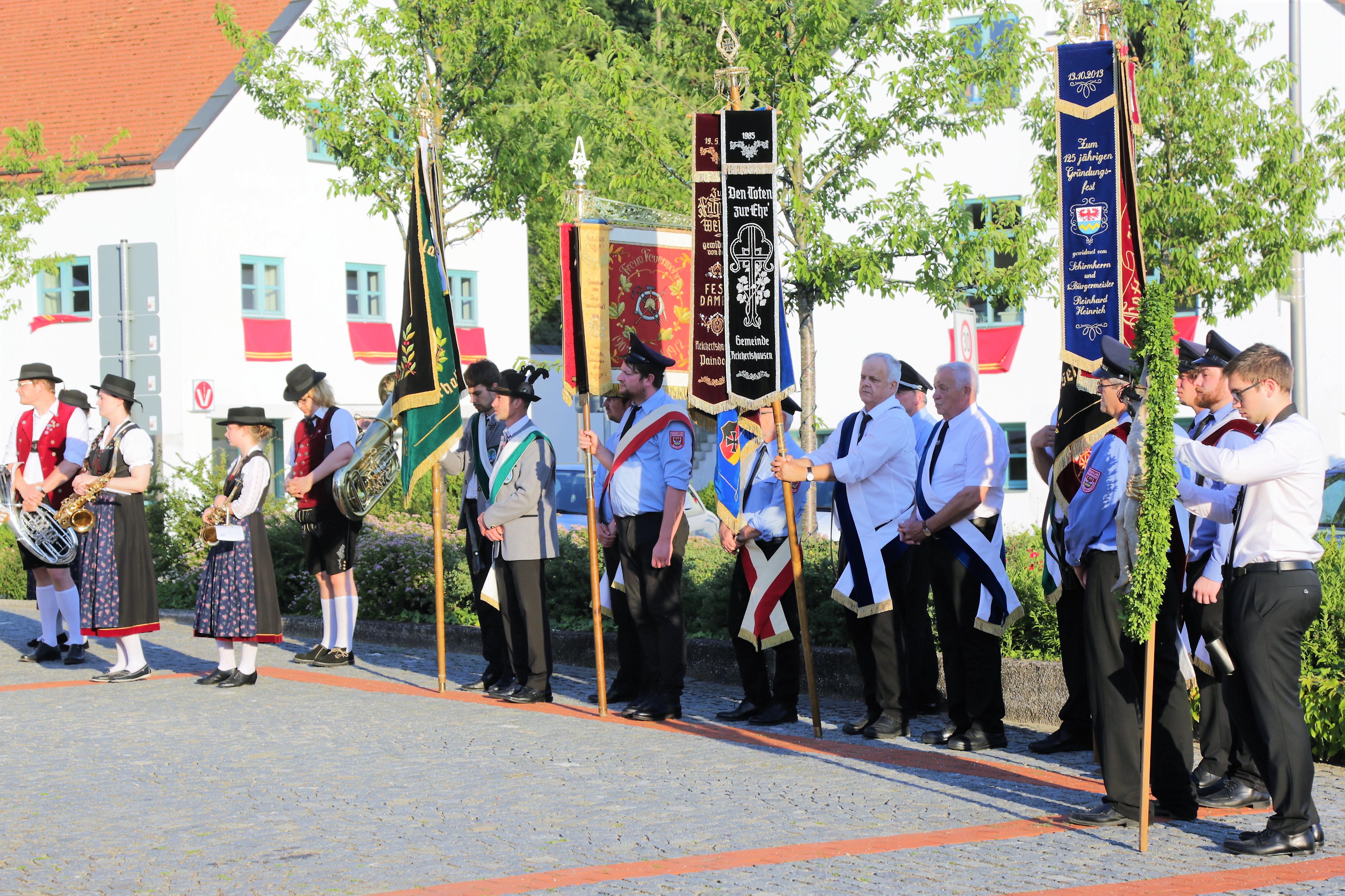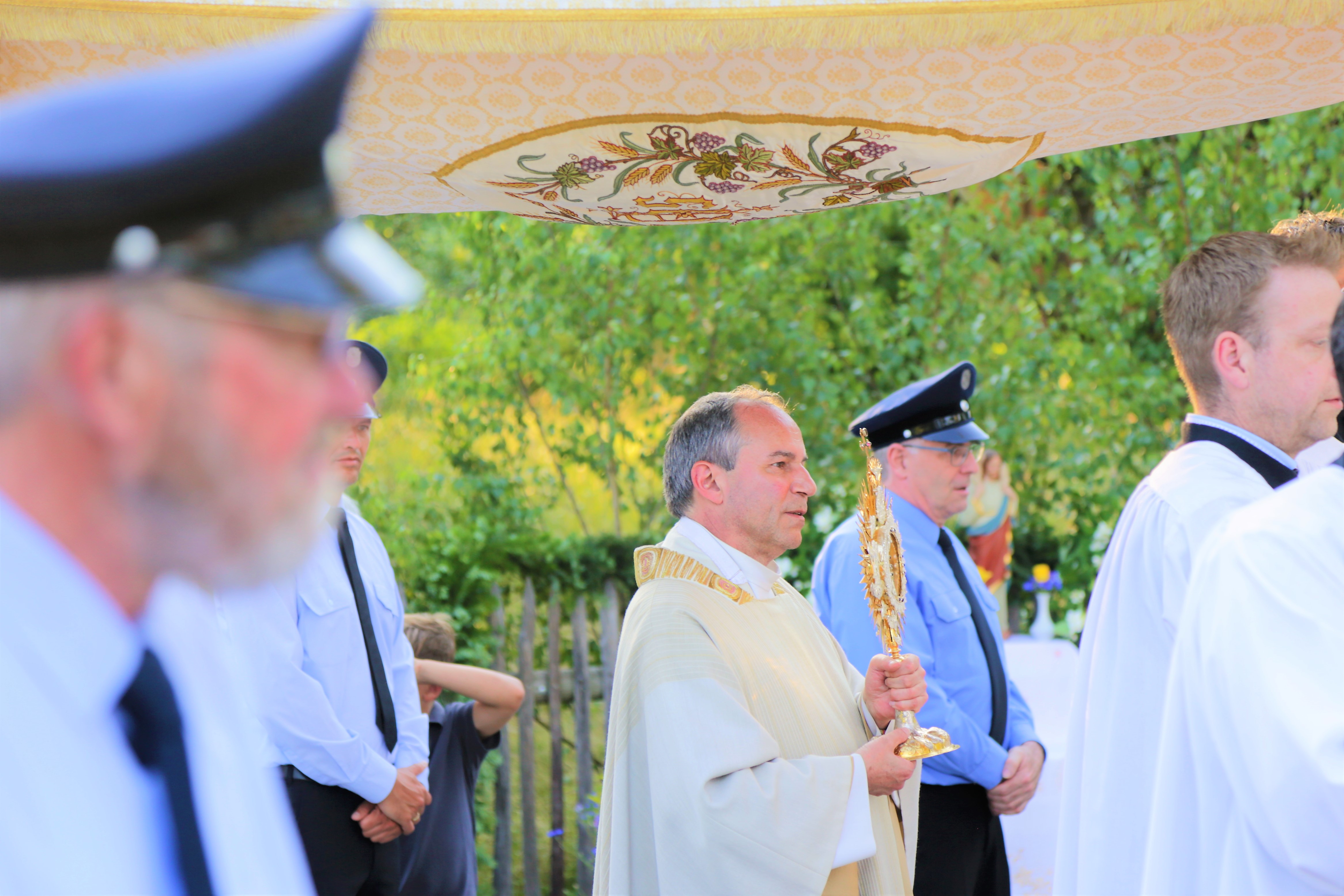 Die ortsansässigen Vereine waren schon zeitig zum Gottesdienst mit ihren Fahnenabordnungen im Altarraum versammelt und viele Gläubige hatten sich in den Bänken eingefunden. Pfarrer Martin zelebrierte einen feierlichen Gottesdienst – musikalisch umrahmt vom Kirchenchor. Wie jedes Jahr stellten sich dann alle Teilnehmer zur Prozession auf, um den Leib Christi in der Monstranz durch den Ort zu tragen. Traditionell waren vier Altäre aufgebaut worden – vier Stationen mit vier verschiedenen Evangelien.